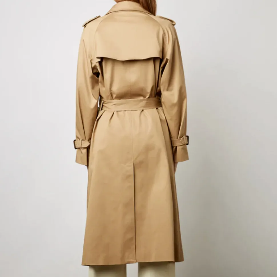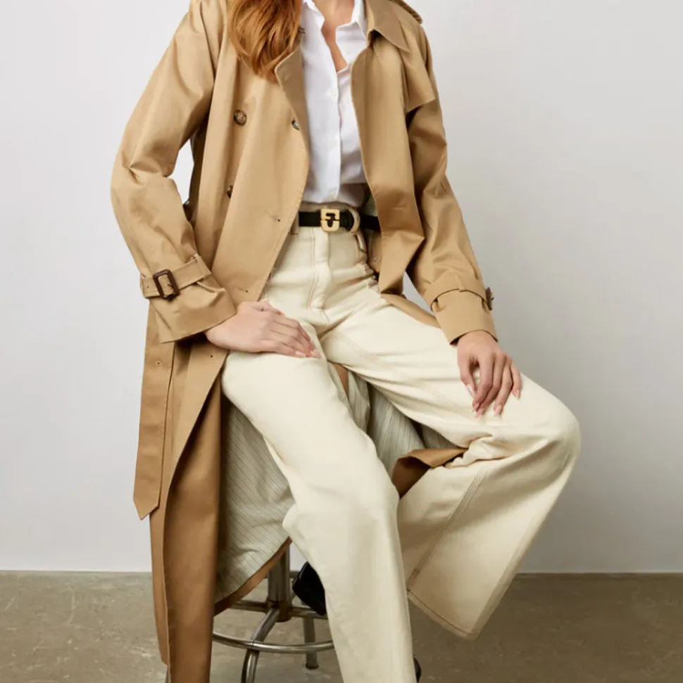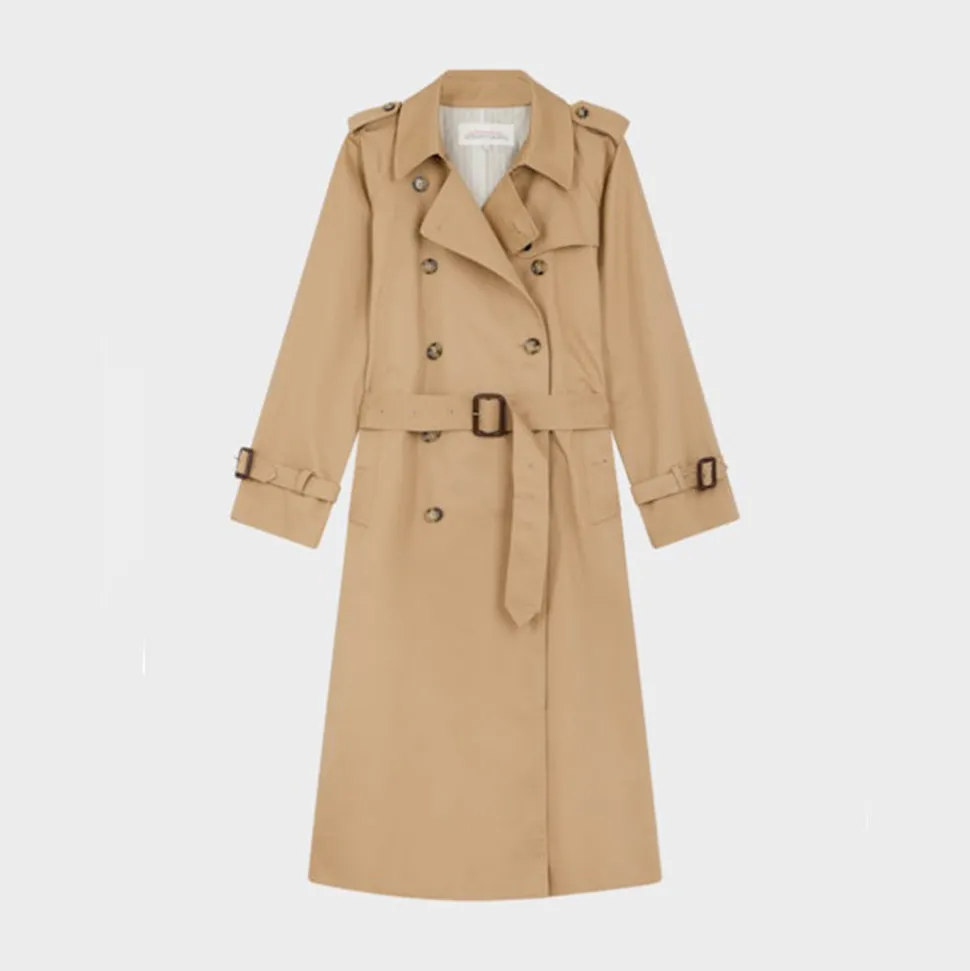 Finitions trench : pattes d’épaule, fermeture par agrafe au col, bavolet au dos, poignets ceinturés, ceinture à boucle