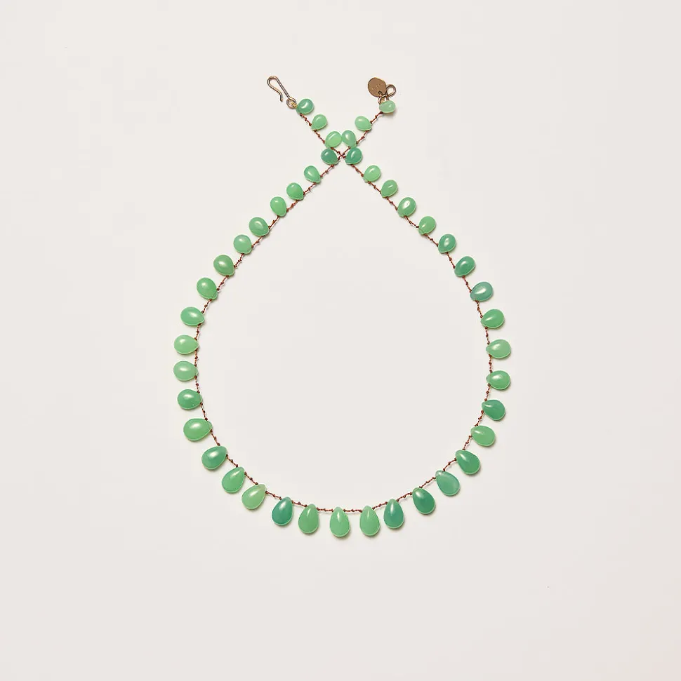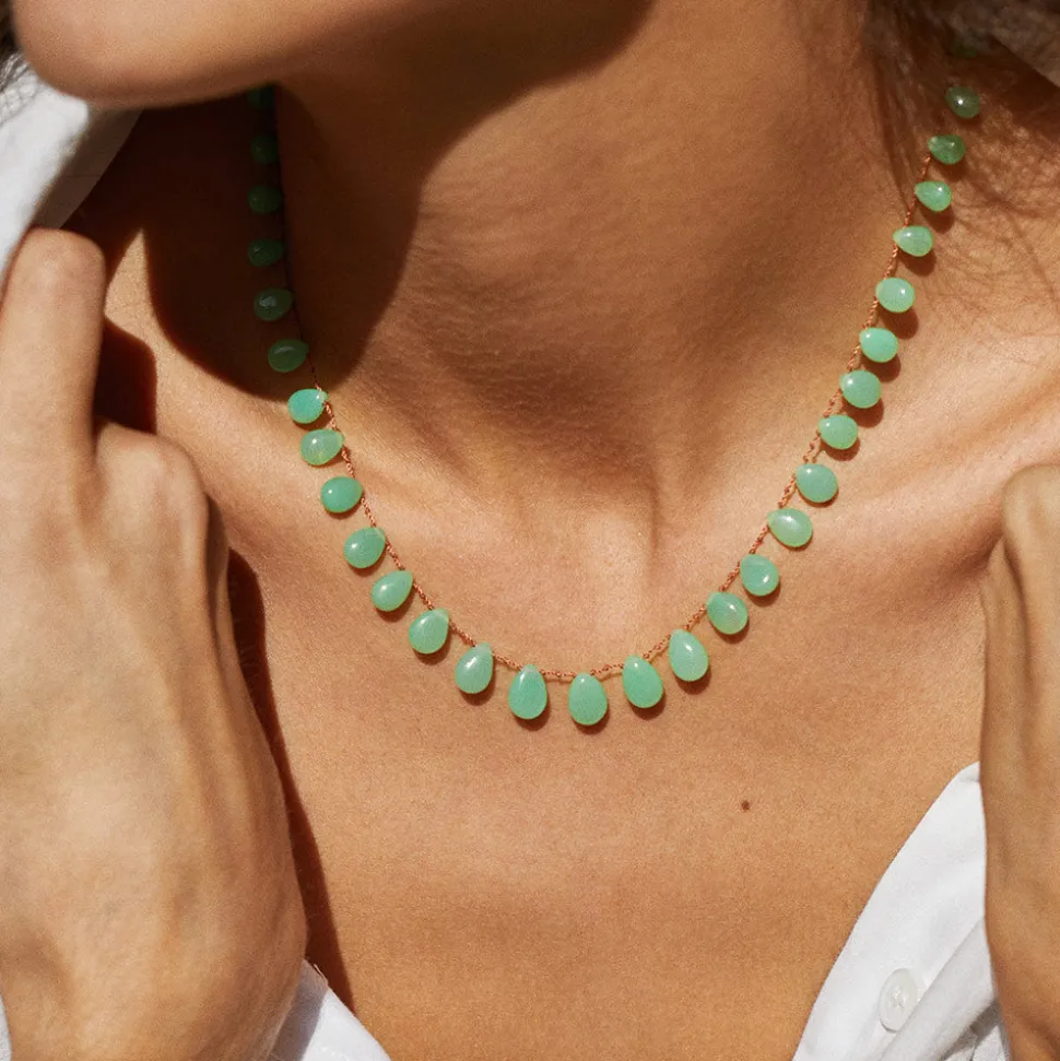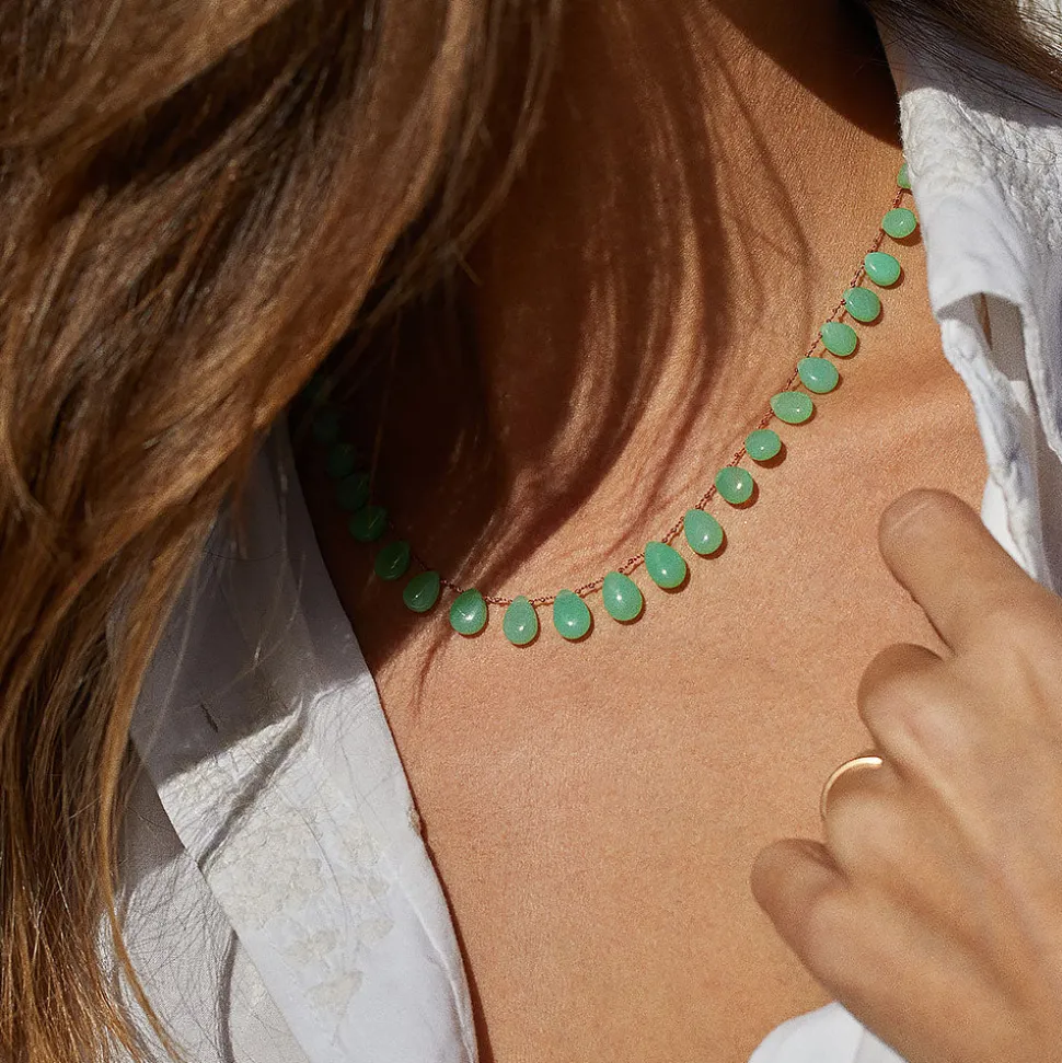 Ivarene est une marque de bijoux qui privilégie les pierres naturelles, montées à la main dans leur atelier parisien. Les pierres, sélectionnées pour leur beauté brute, sont polies sans traitement, offrant des couleurs naturelles et des dégradés harmonieux. Chaque création est unique, montée sur un cordon perlé avec des nœuds, créant l’illusion que les pierres flottent.