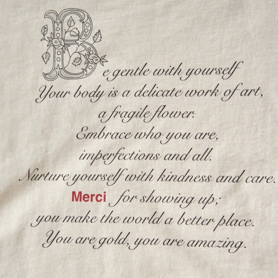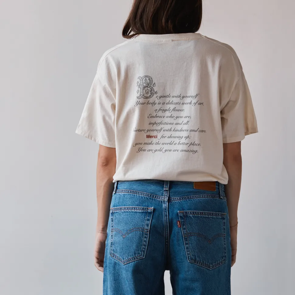 En France, près d’un million de personnes souffrent de TCA (troubles de la conduite alimentaire). Amélie, artiste et amie de Merci, qui est sensible au combat contre les TCA, souhaite accompagner et aider ces personnes en leur proposant des solutions et du soutien. Pour y parvenir, elle décide de désigner ce t-shirt en association avec Merci, afin que tous les bénéfices des ventes soient reversés à la FFAB (Fédération Française Anorexie Boulimie) .