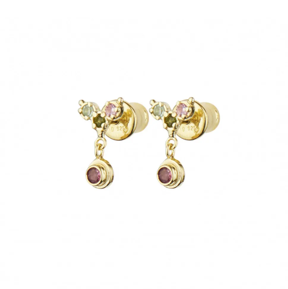 Paire de mini-boucles d’oreilles en argent massif composée de plusieurs pierres tourmalines de couleurs dépareillées dorées à l’or fin jaune