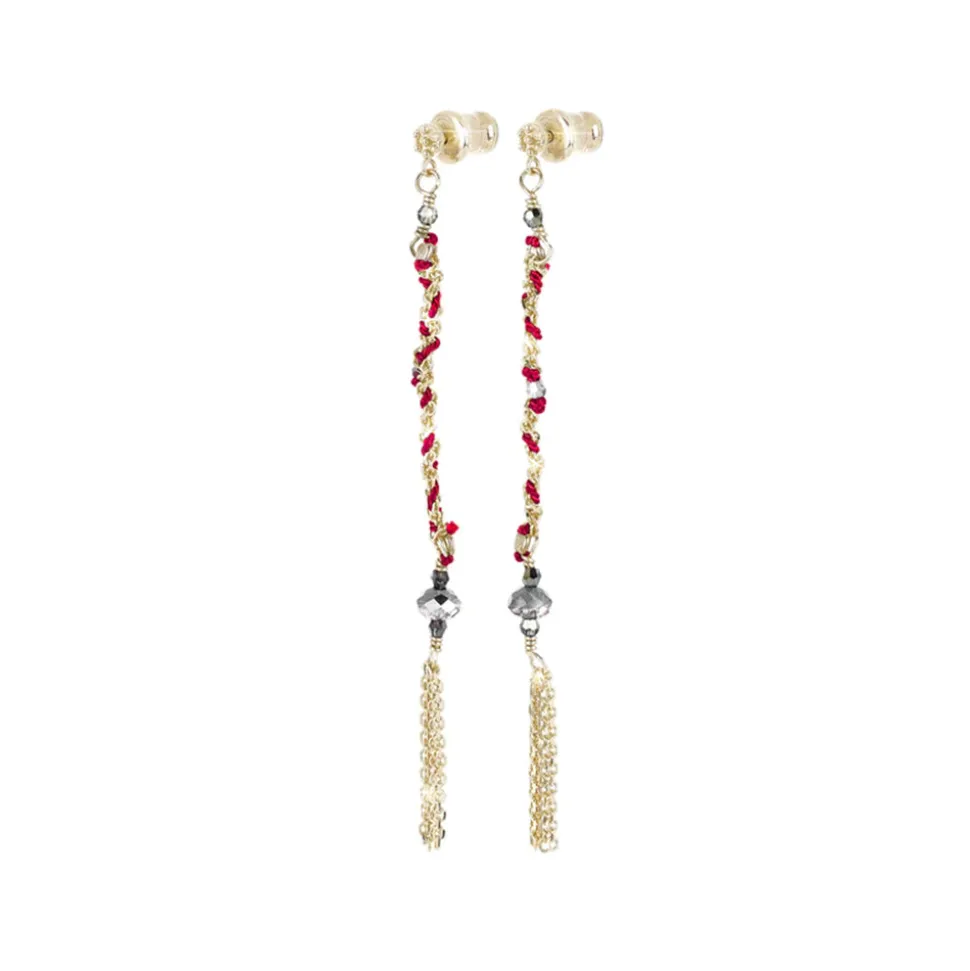 Paire de boucles d’oreilles tressées en Argent 925 composée de fines chaînes dorées et de fils de soie gris se finissant par de petites perles de cristal et des pompons de chaînes