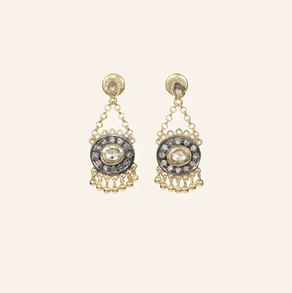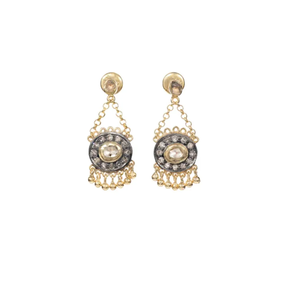 Paire de boucles d’oreilles en argent 925 doré, composée de médaillons en argent oxydé suspendus à des chaînettes et sertis de diamants Polki et de diamants irréguliers.