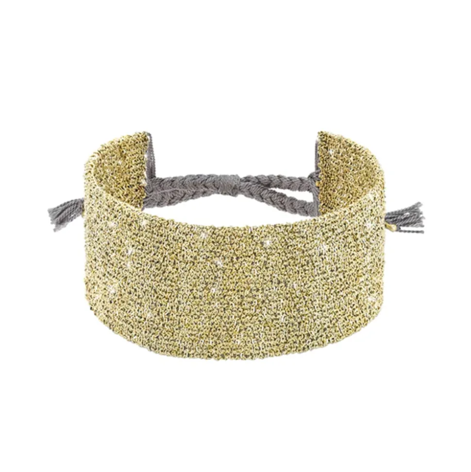 Bracelet manchette tissé en argent 925, composé de fines chaines dorées et de fils de soie gris