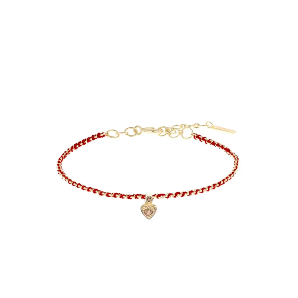 Bracelet tressé en argent 925, composé d’une chaîne dorée et de fils de soie rouges.
