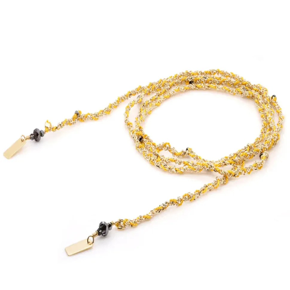 Chaînes en argent massif 925 doré à l’or fin 18 carats et d’un fil de soie torsadé de couleur incrusté de petites perles de cristal
