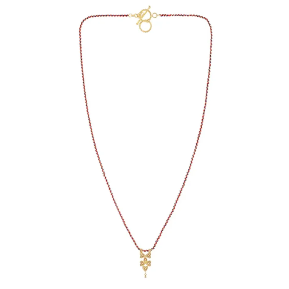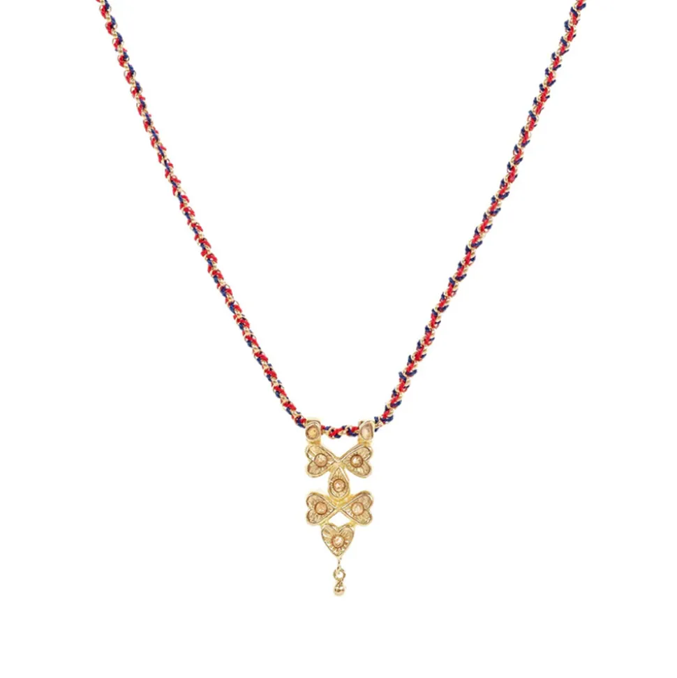 Collier mi long tressé en argent 925, composé d’une chaîne dorée et de fils de soie rouge.