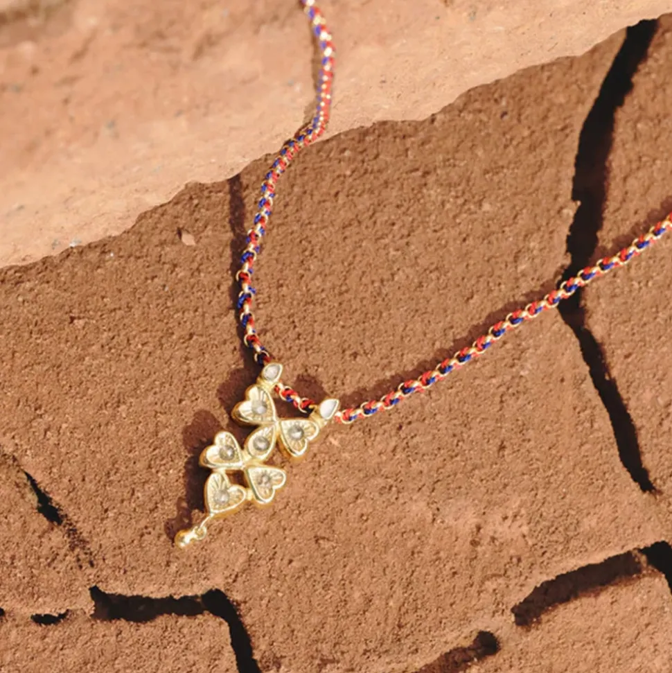 Il est agrémenté d’un pendentif ajouré, formé de motifs coeurs et de motifs gouttes délicatement assemblés, sertis de diamants Polki.