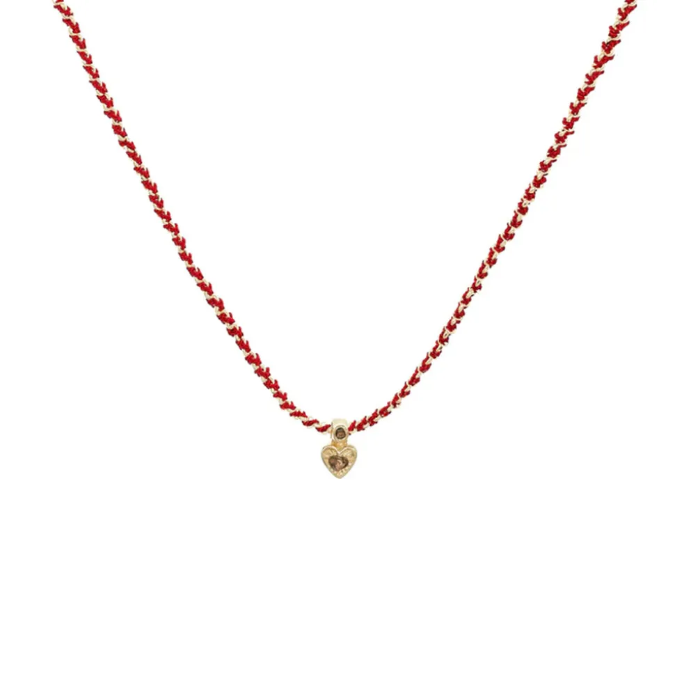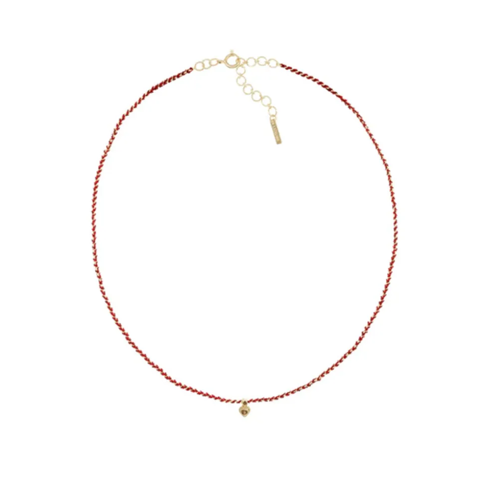 Collier court tressé en argent 925, composé d’une chaîne dorée et de fils de soie rouges. Il est doté d’un charme en forme de coeur orné de deux diamants Polki.