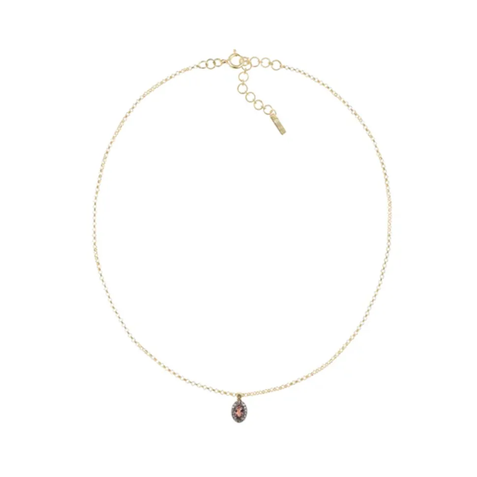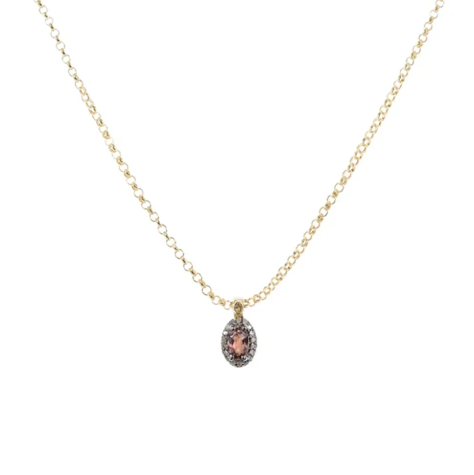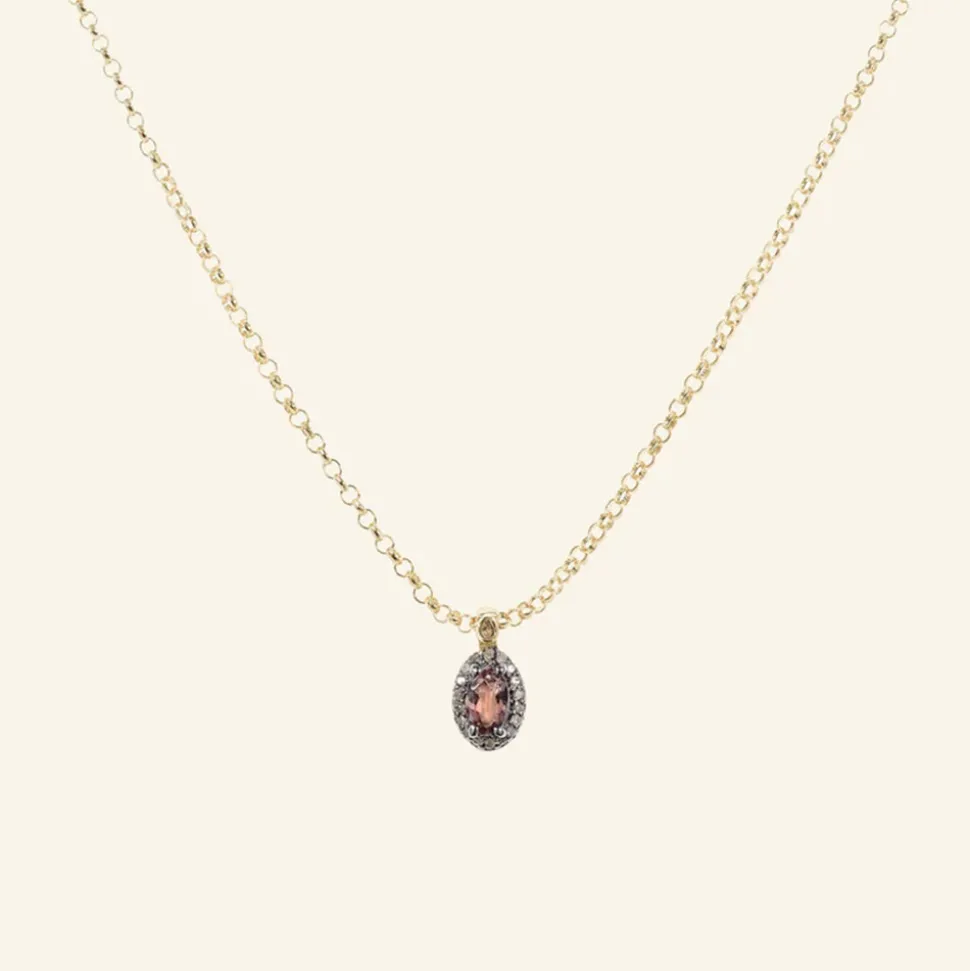 Il est doté d’un médaillon en argent oxydé, serti d’une Tourmaline rose et de mini diamants irréguliers