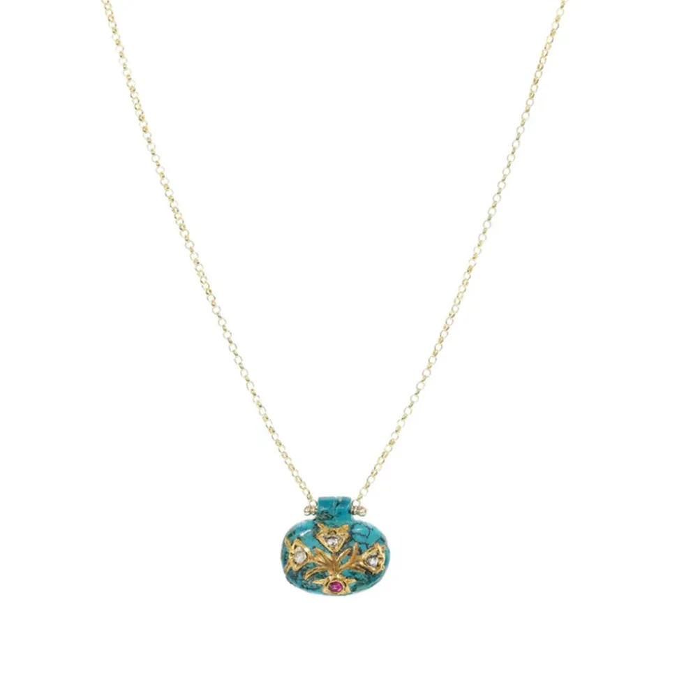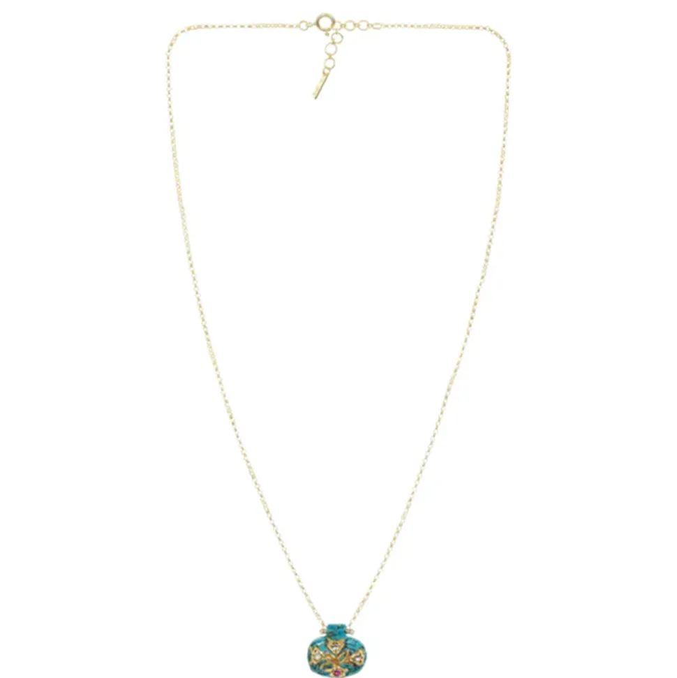 Il est doté d’un pendentif en pierre Chrysocolle en forme de galet, incrusté d’un motif floral doré, finement ciselé.