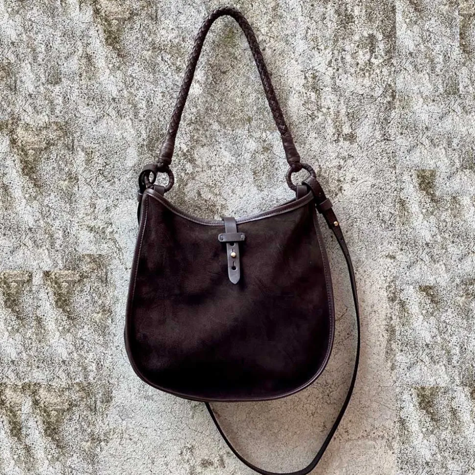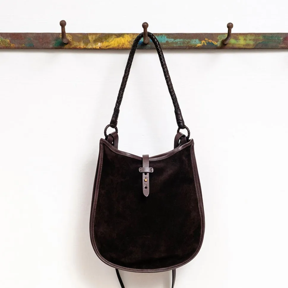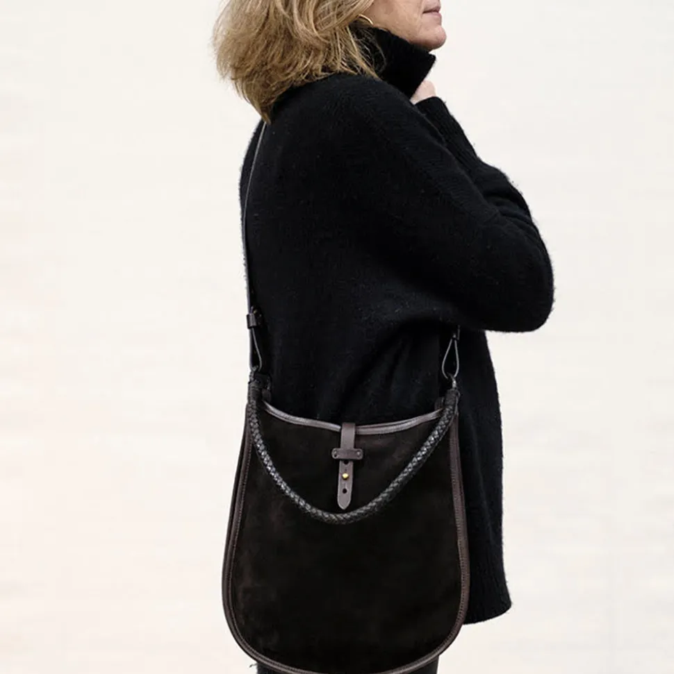 Courte poignée tressée et bandoulière en cuir réglable et amovible.