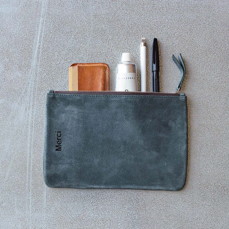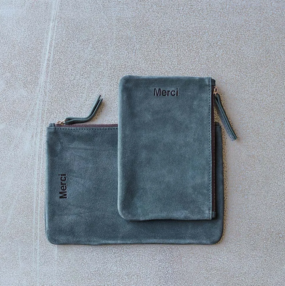 Les pochettes en daim Merci sont idéales pour toutes occasions : à glisser dans un sac et emporter partout avec vous, …