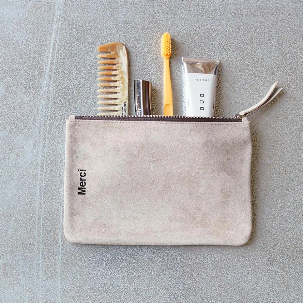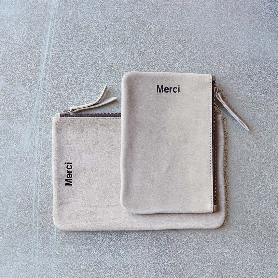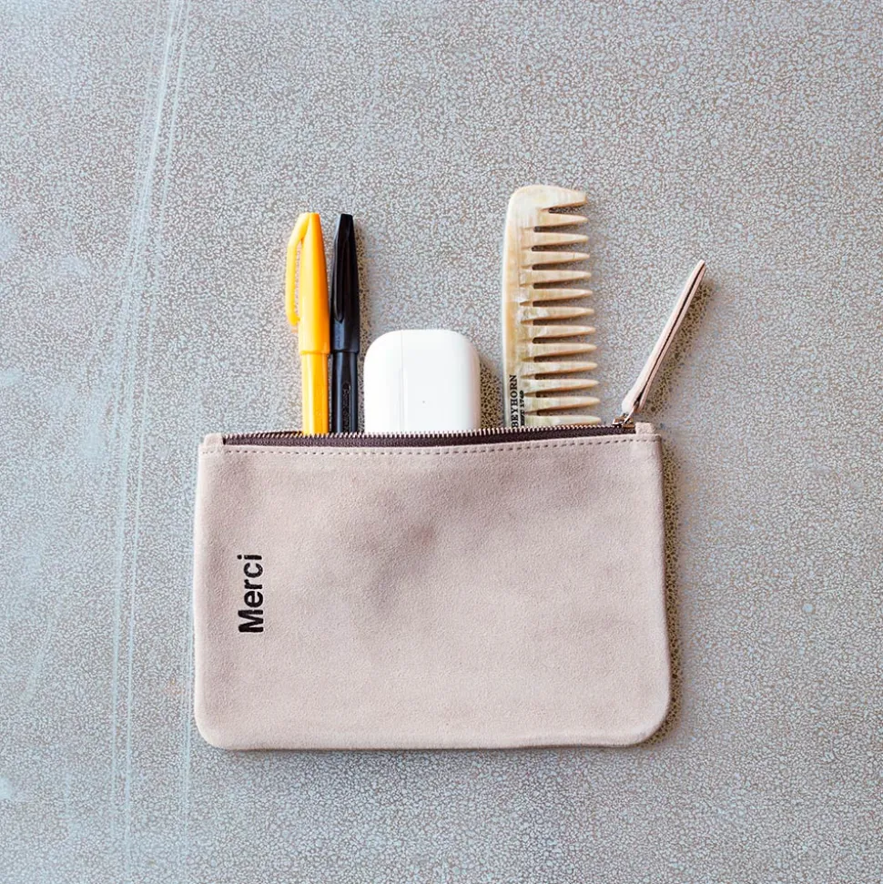 Les pochettes en daim Merci sont idéales pour toutes occasions : à glisser dans un sac et emporter partout avec vous, à amener en vacances… Avec leur design sobre et élégant, ces pochettes sont des accessoires incontournables.