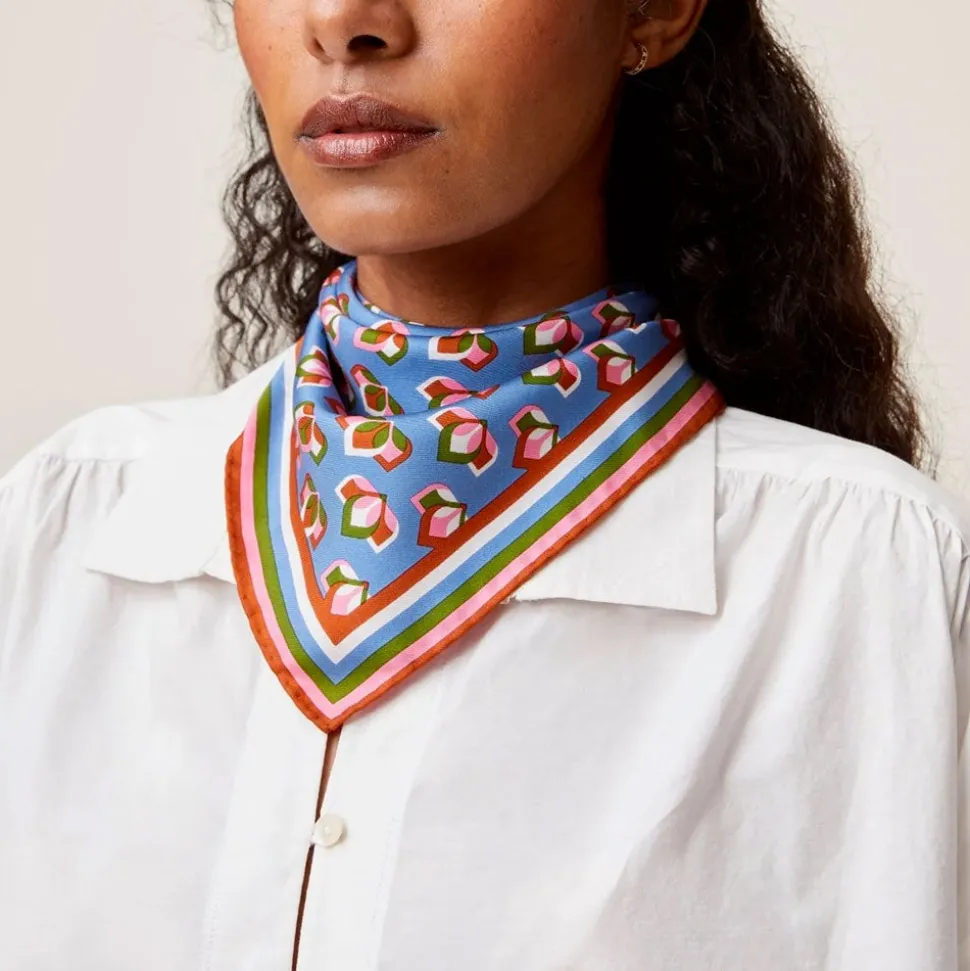 Entretien: Pour préserver votre foulard, lavez-le à la main, à l’eau froide de préférence. Conservez-le dénoué et à plat pour éviter de le froisser. Séchage à l’air libre et repassage doux max 100°
