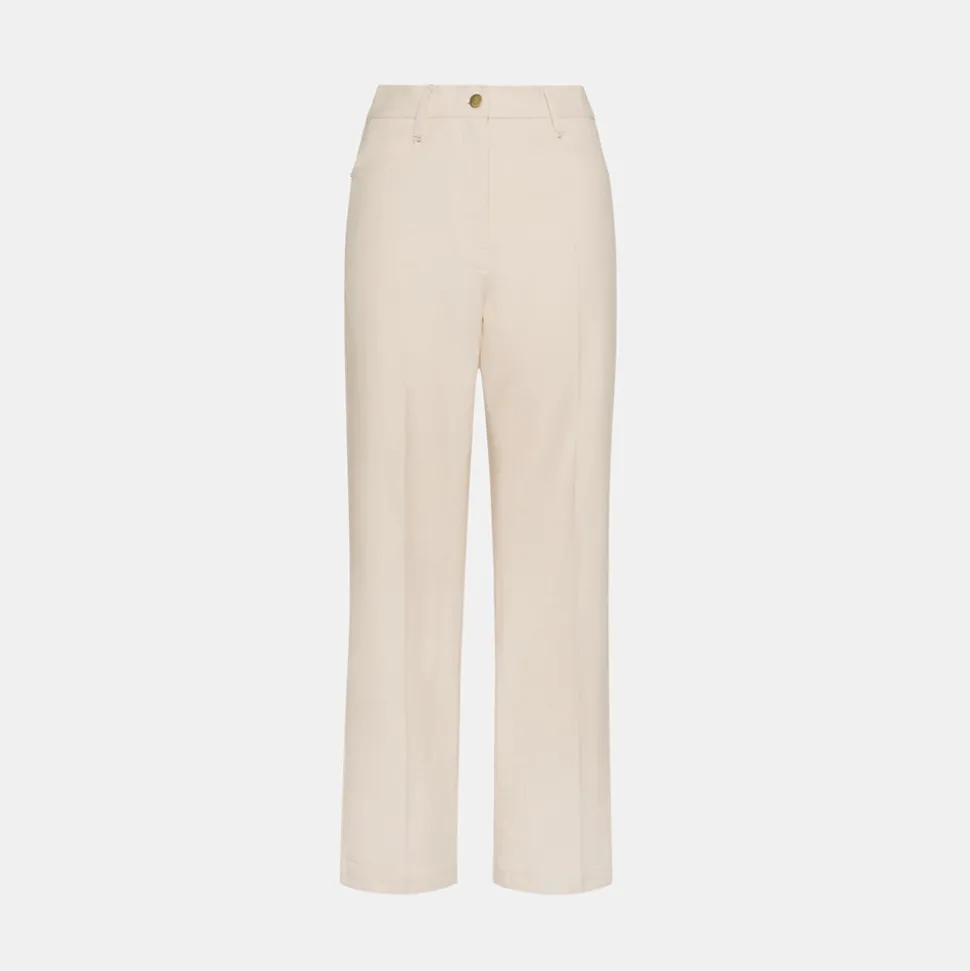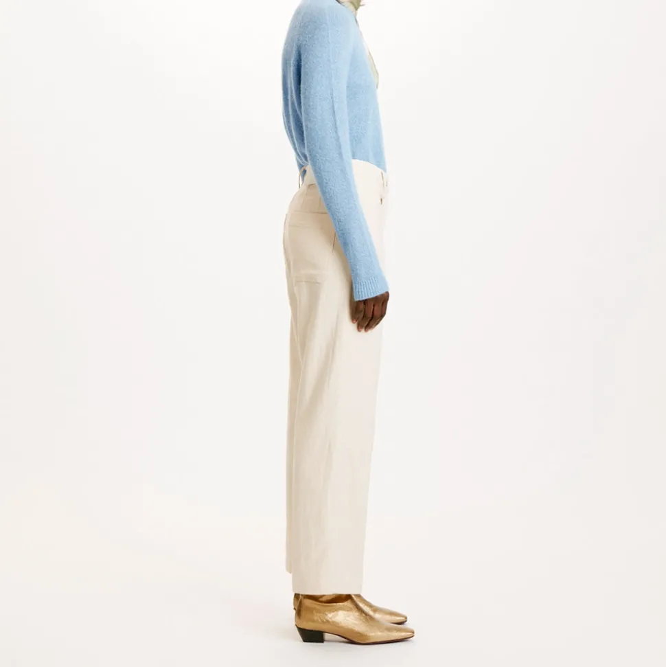 Taille haute, entrejambe régulier, poches devant cavalières ornées de rivets.