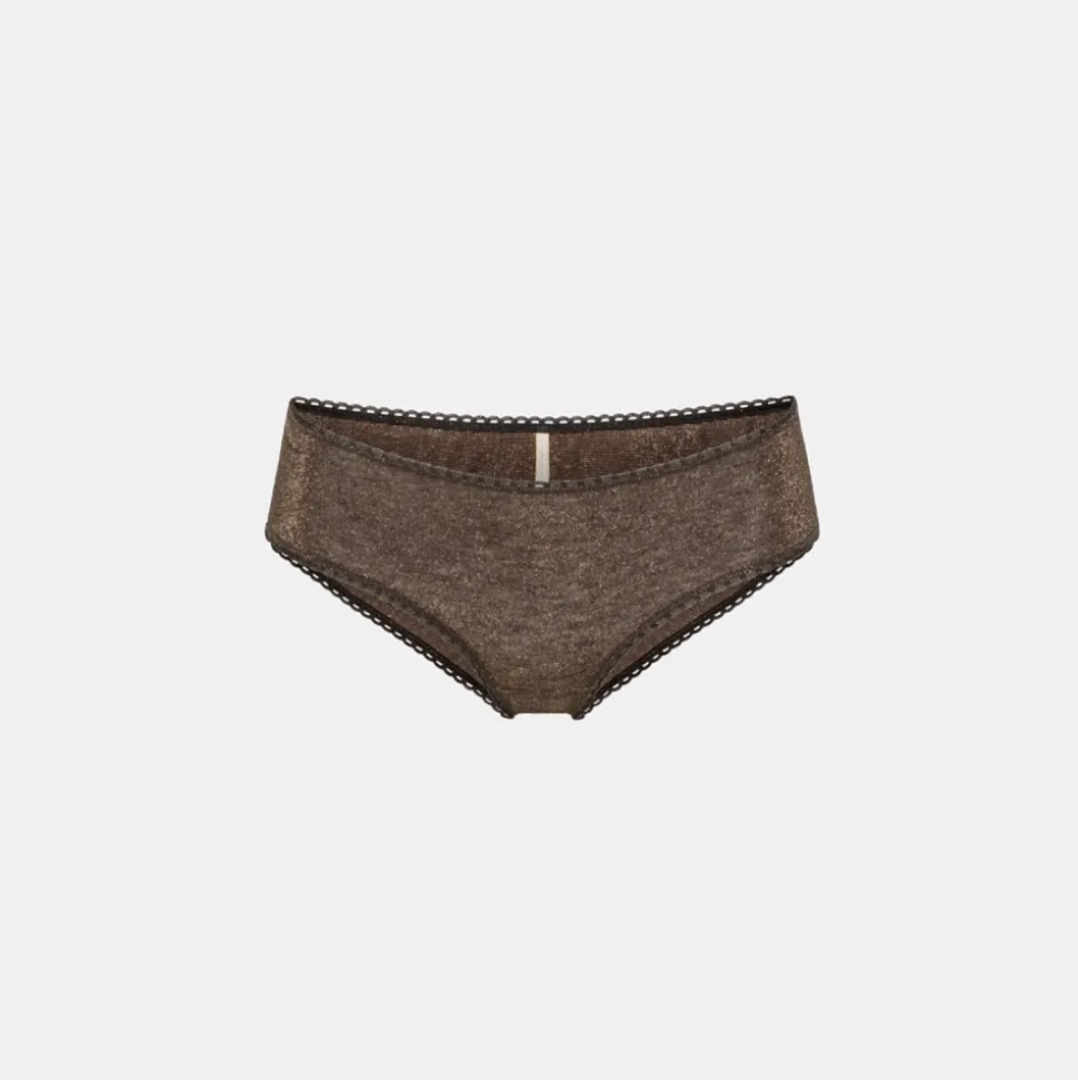 Slip intemporel modèle culotte en doux jersey lurex stretch, orné de passementerie élastique de la même couleur.
