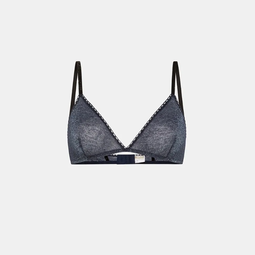 Soutien-gorge iconique de Momonì, Amethist présente des bonnets triangulaires en doux jersey lurex stretch, ornés de passementeries élastiques.