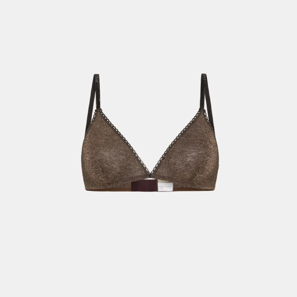 Soutien-gorge iconique de Momonì, Amethist présente des bonnets triangulaires en doux jersey lurex stretch, ornés de passementeries élastiques.