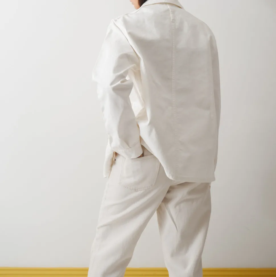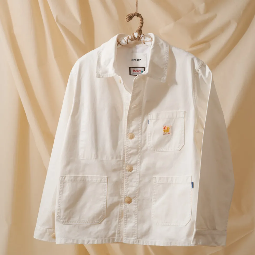 Merci est fier de présenter sa nouvelle collaboration avec deux marques qui lui sont chères : l’intemporelle NN. 07 et la marque de workwear Le Laboureur. De cette collaboration est née une veste en édition limitée, confectionnée à partir de coton blanc lavé. Produite en Bourgogne, la veste s’inspire des vêtements de travail emblématiques Le Laboureur, tout en intégrant le soft tailoring caractéristique de NN. 07, créant une pièce à la fois fonctionnelle et élégante.