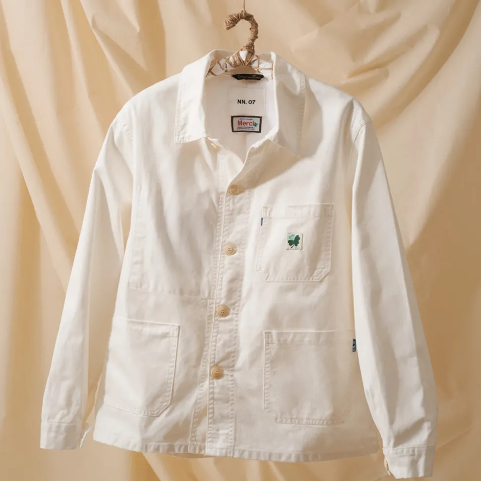Merci est fier de présenter sa nouvelle collaboration avec deux marques qui lui sont chères : l’intemporelle NN. 07 et la marque de workwear Le Laboureur. De cette collaboration est née une veste en édition limitée, confectionnée à partir de coton blanc lavé. Produite en Bourgogne, la veste s’inspire des vêtements de travail emblématiques Le Laboureur, tout en intégrant le soft tailoring caractéristique de NN. 07, créant une pièce à la fois fonctionnelle et élégante.