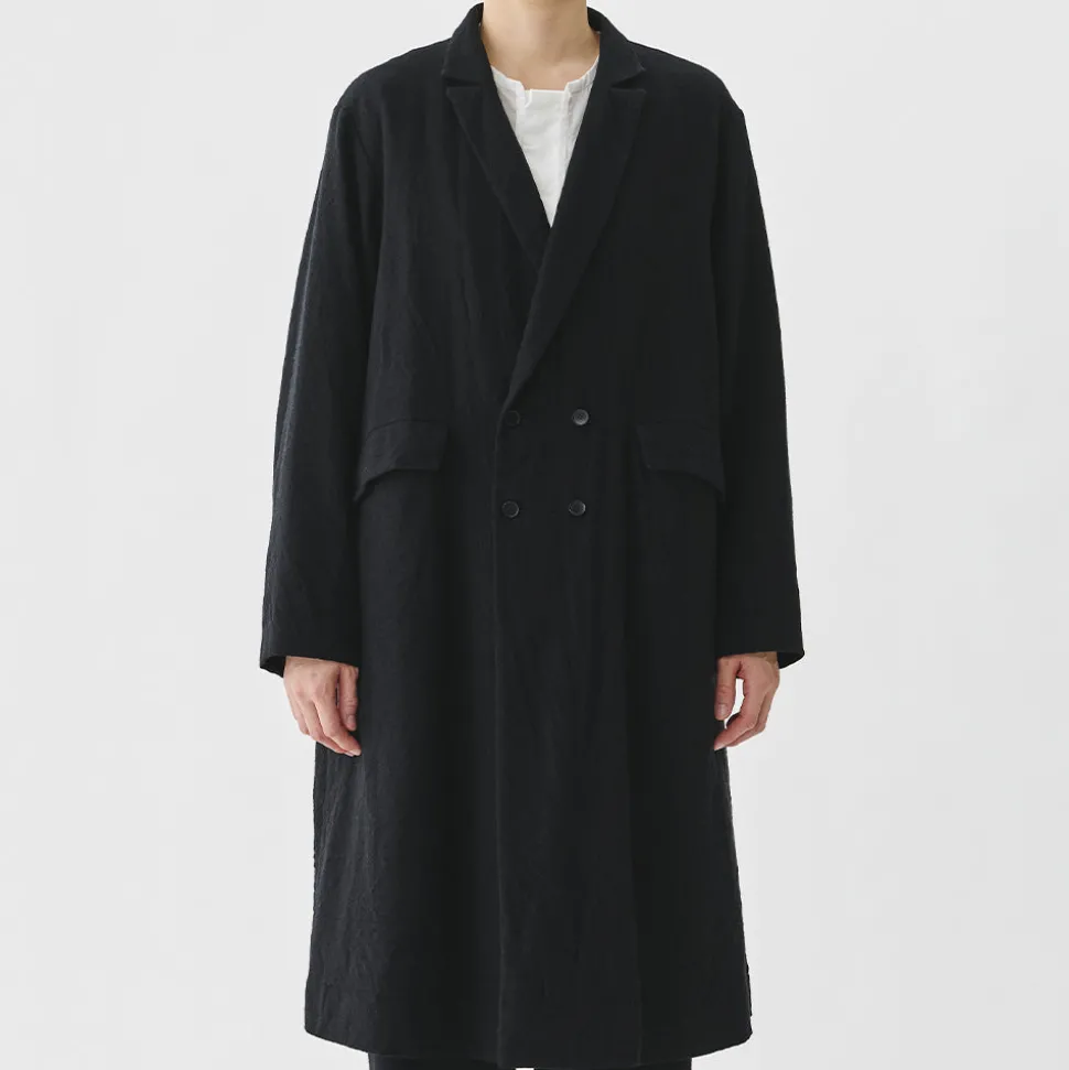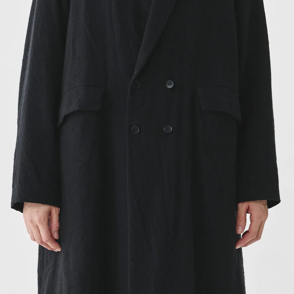 Manteau à double boutonnage et à revers, à la silhouette masculine, de type « Boxy ». Le terme « peak » désigne une pointe acérée, et la caractéristique de ce manteau est son col pointu et acéré.