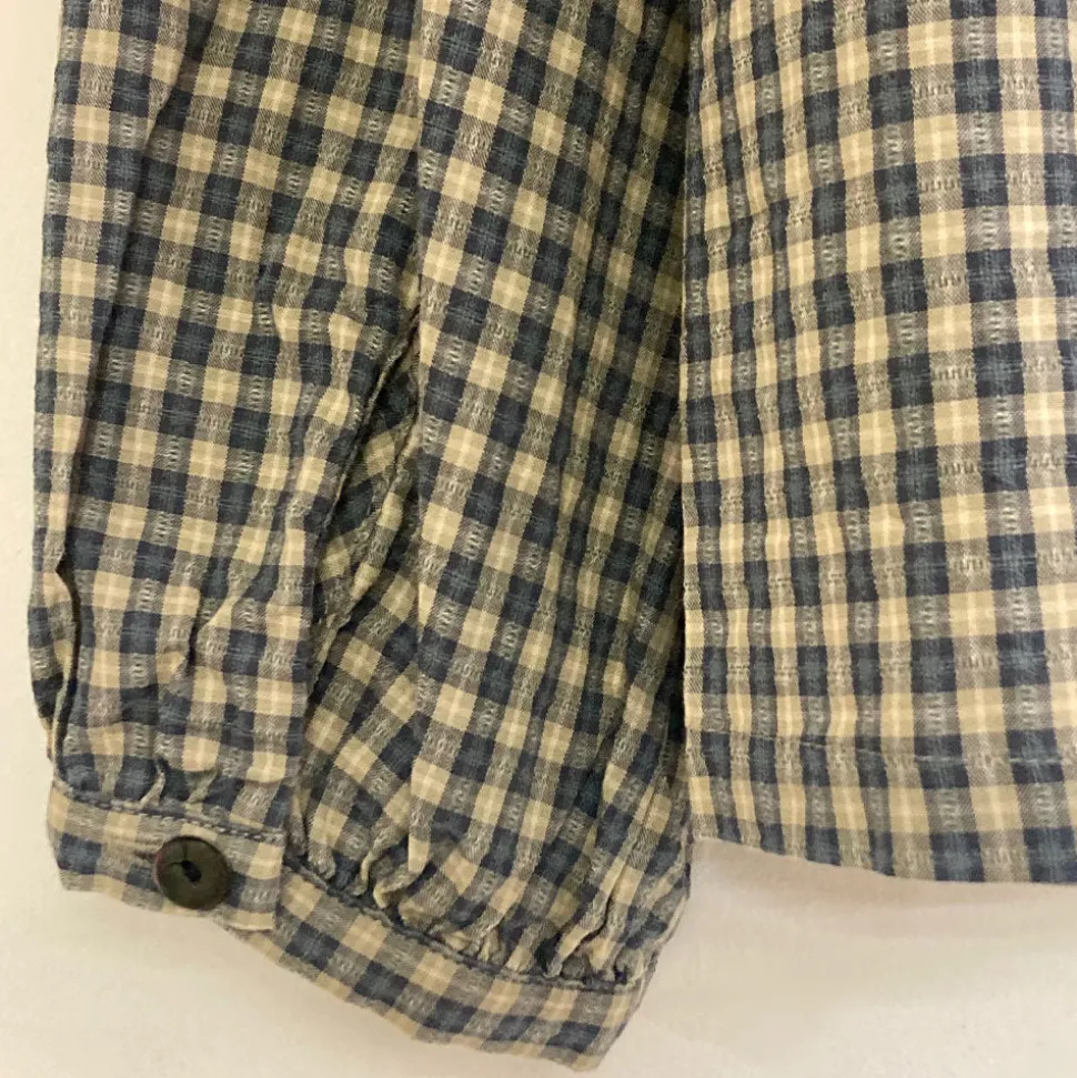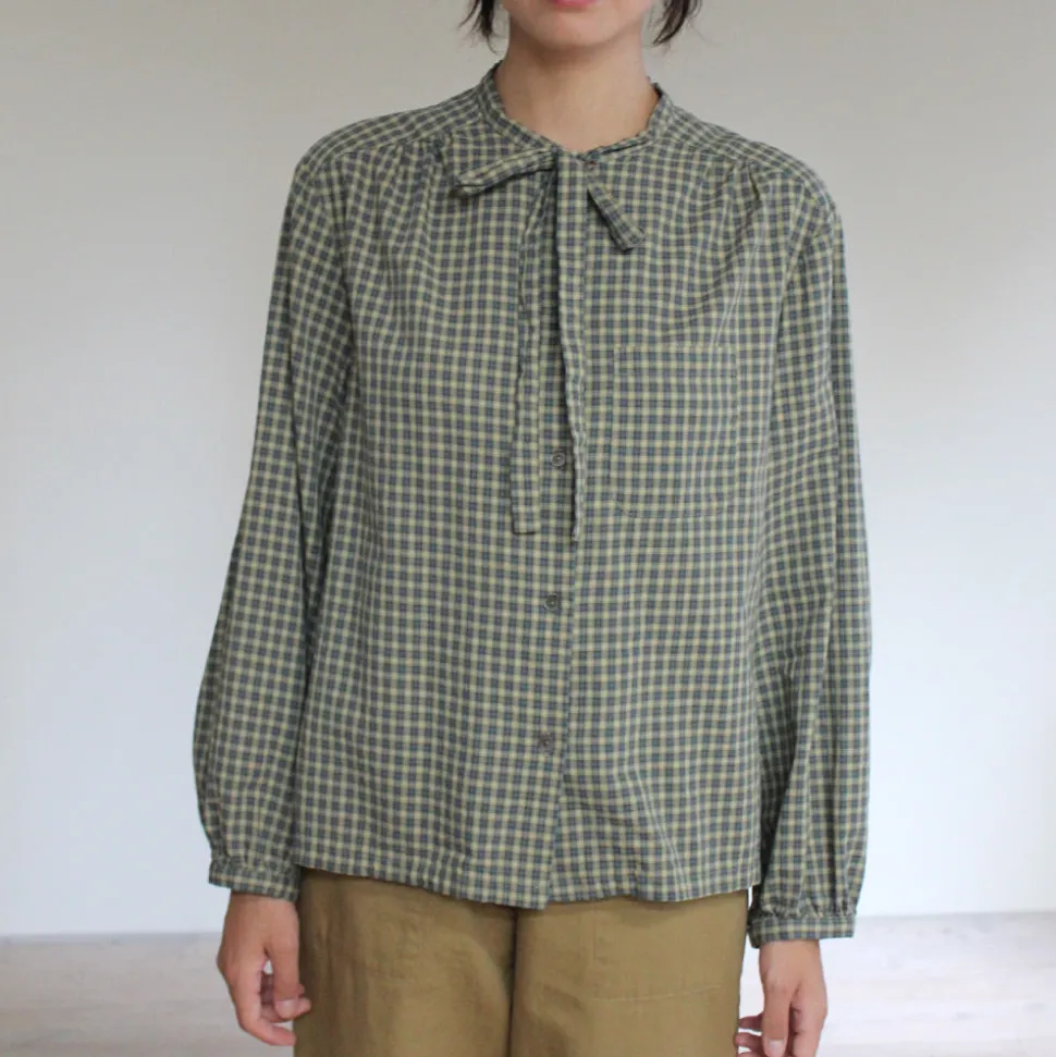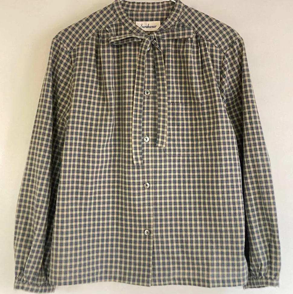 Ce chemisier présente un nœud papillon avec un motif de rayures et des détails sophistiqués