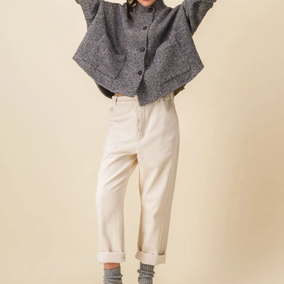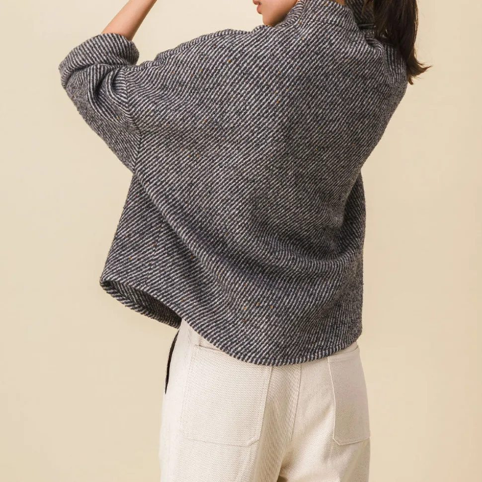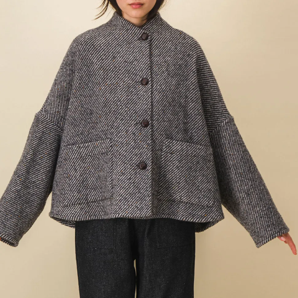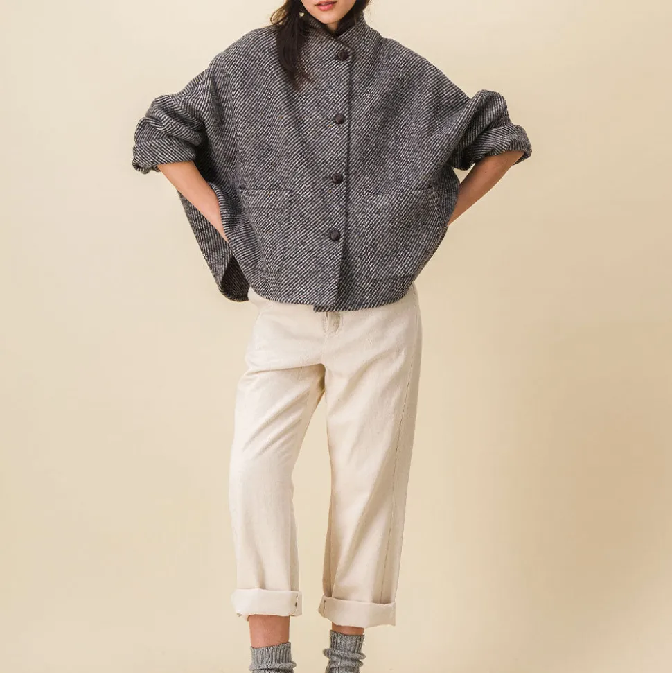 Forme très oversize, manches basses, non doublée, comme une petite cape, col intégré pour un volume épuré, deux poches plaquées,