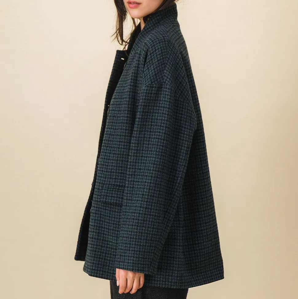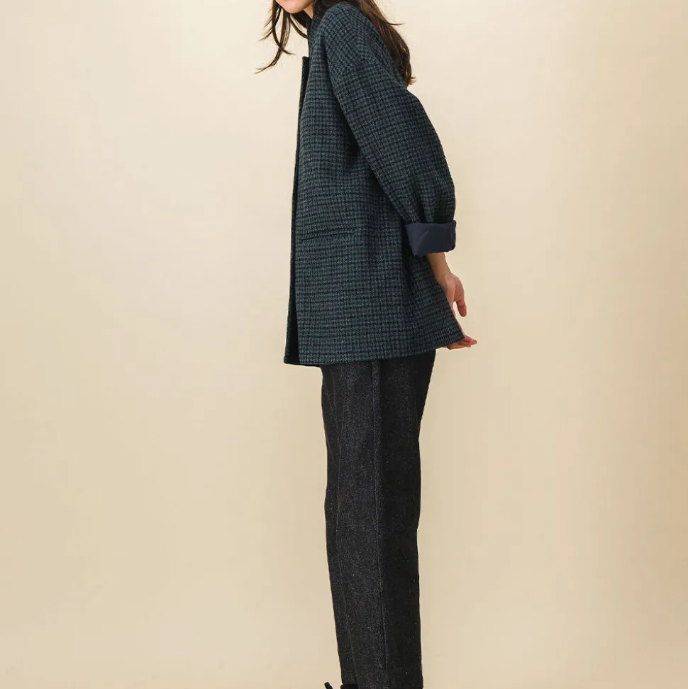 Col tailleur inversé, poches passepoilées, manches kimonos, fermeture 4 boutons, peut se ceinturer avec une corde.