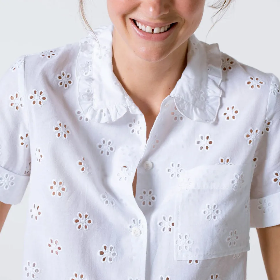 Col chemise sans pied de col avec volant froncé tout autour, brodé d’un petit point de bourdon sur son bord.