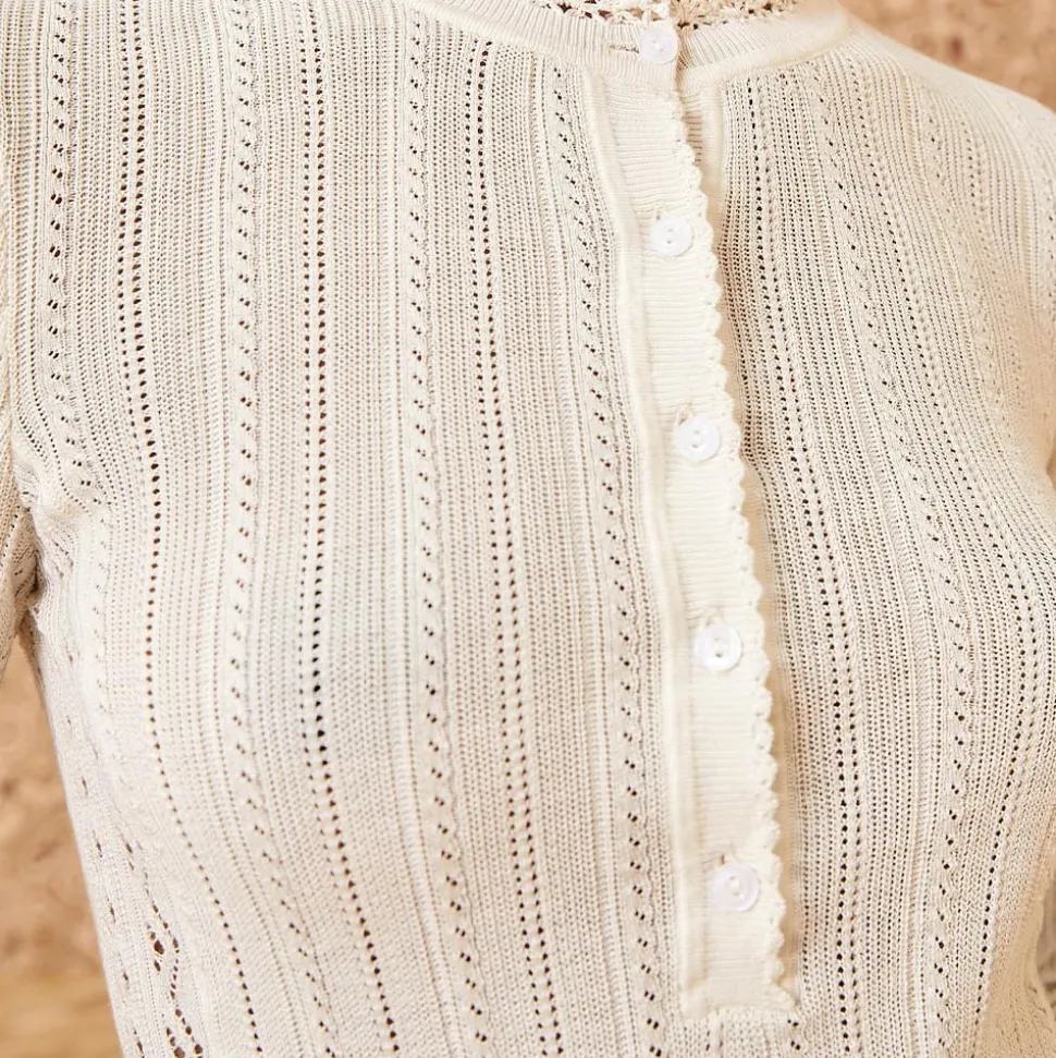 Notre Delia Top, qui permet de superposer les couches, est filé à partir du coton et de la soie les plus fins dans une maille pointelle dynamique inspirée des textiles anciens.