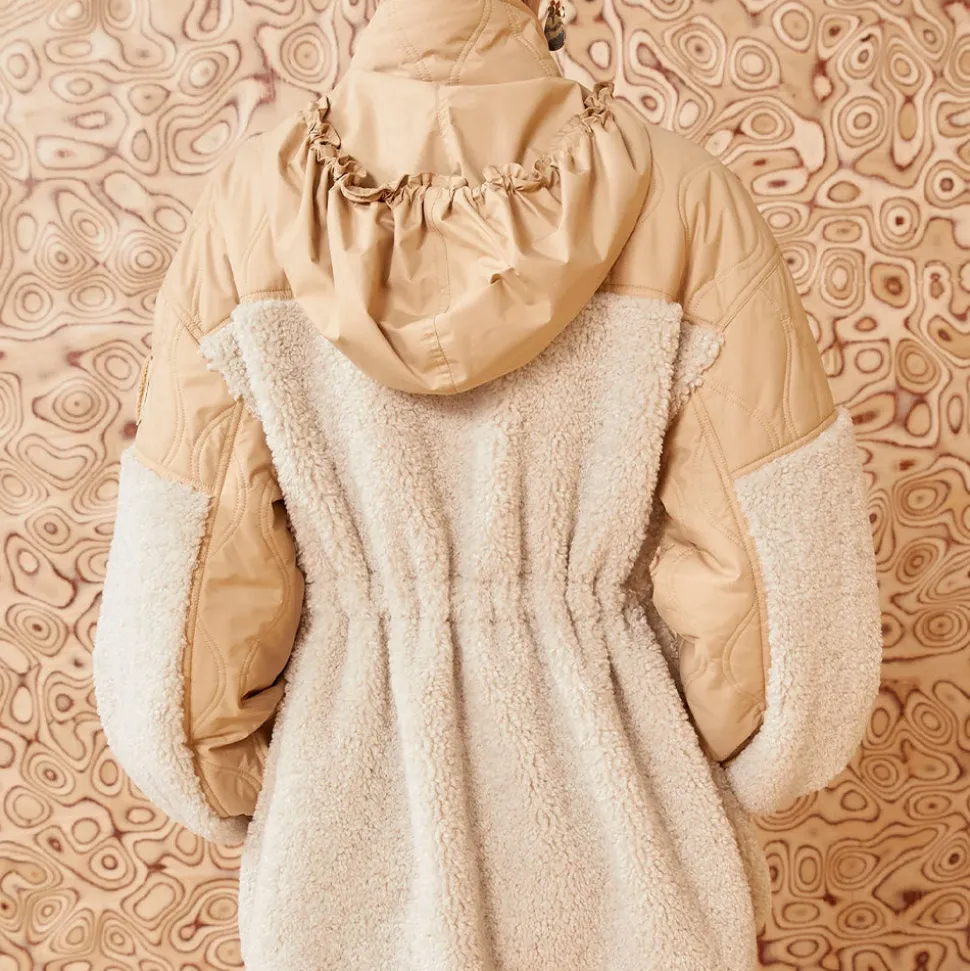 Notre manteau Hayes vous enveloppe dans un luxueux mélange de polaire et de satin matelassé léger.