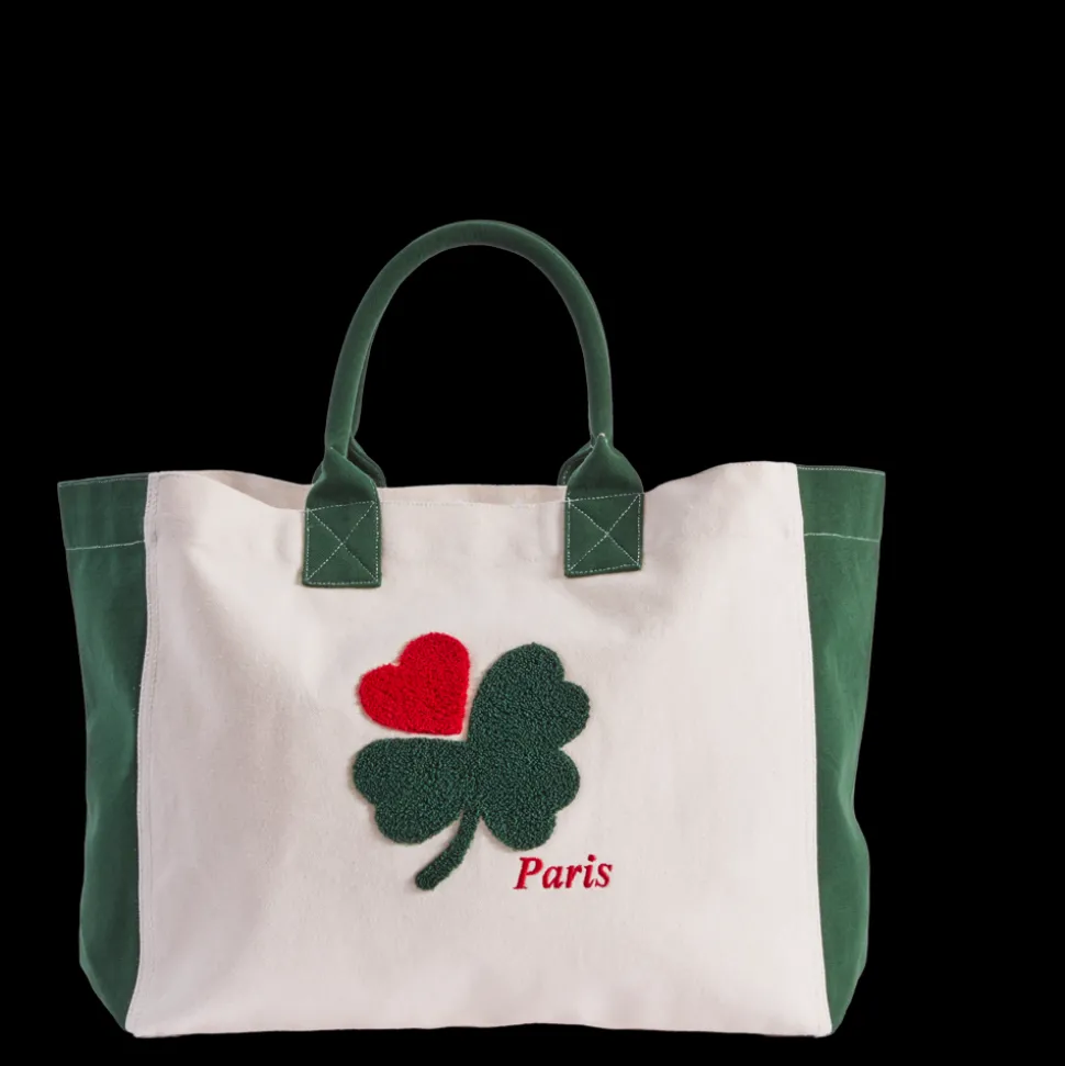 Le Cabas trèfle en toile 100% coton est disponible en bleu, vert, violet et rose. A porter à la main, il porte fièrement le Trèfle-Cœur en broderie bouclette sur l’avant et possède une petite poche intérieure.