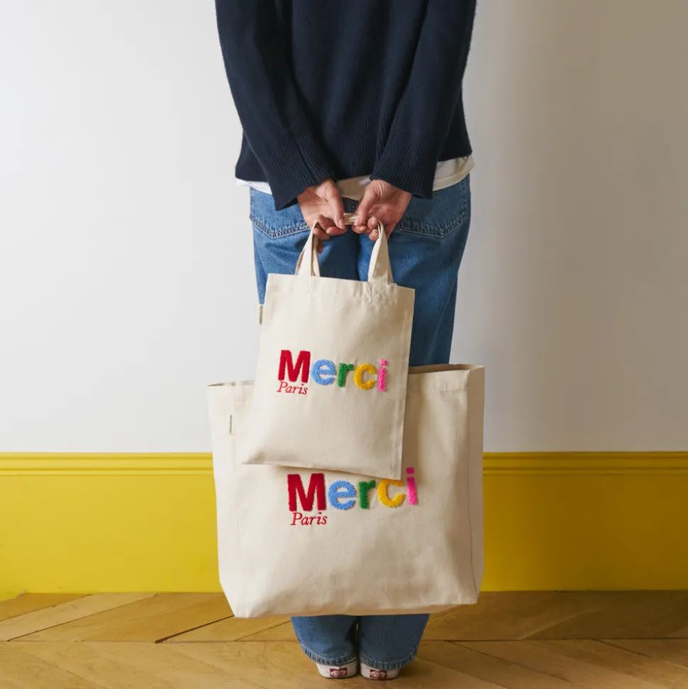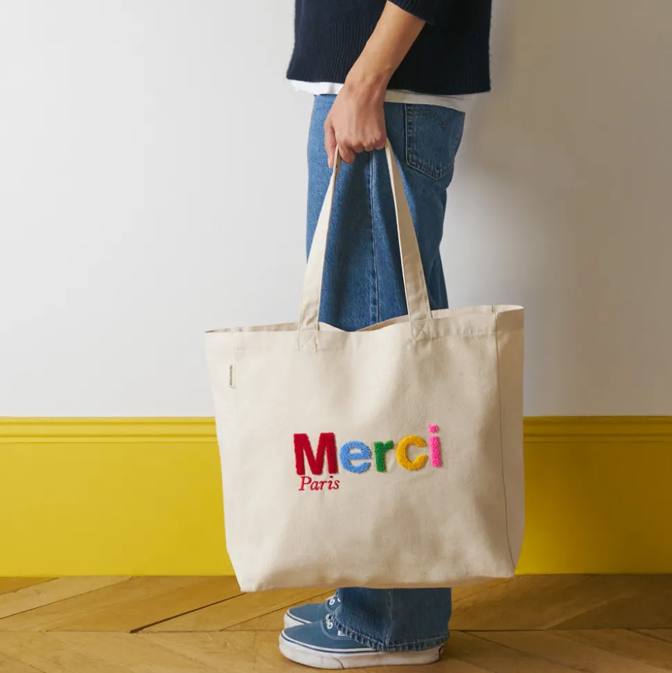 L’iconique tote bag Merci deviendra votre allié du quotidien. Emportez un peu de Merci partout avec vous grâce à ce t…