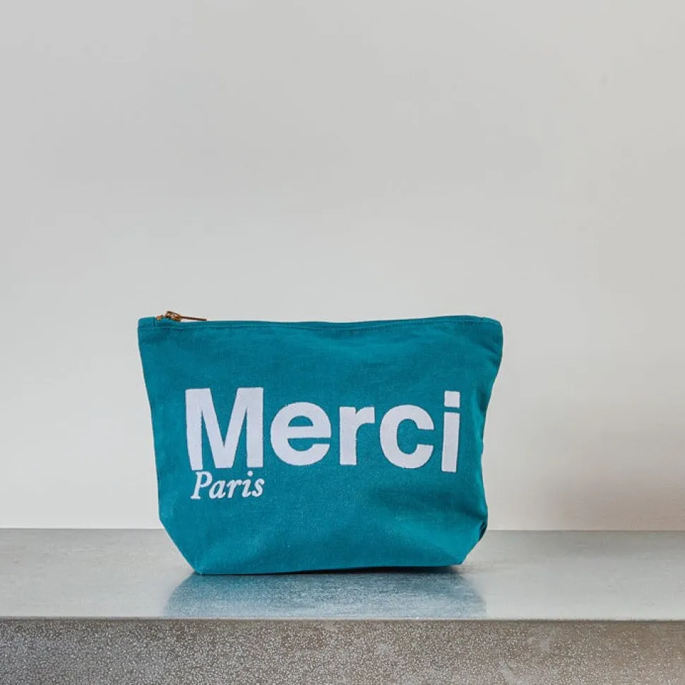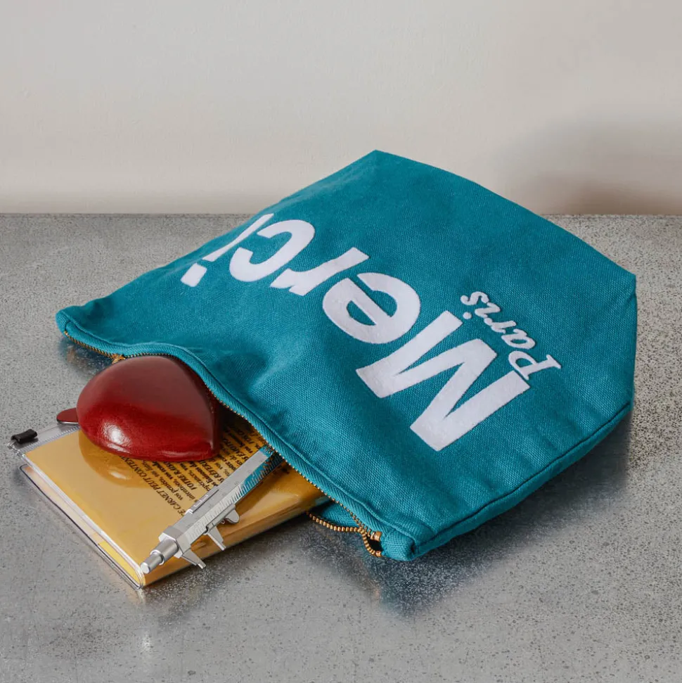 Merci adapte son iconique tote bag en format de pochette. Emportez un peu de Merci partout avec vous grâce à cette poc…
