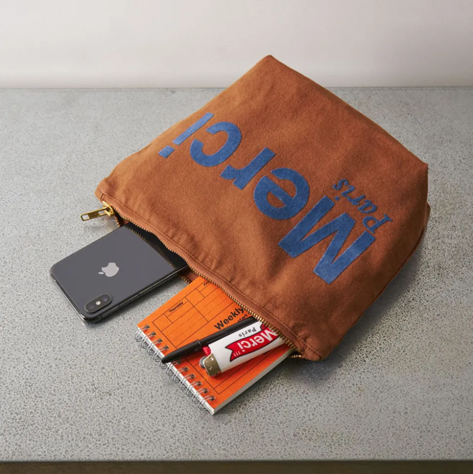 Merci adapte son iconique tote bag en format de pochette. Emportez un peu de Merci partout avec vous grâce à cette poc…