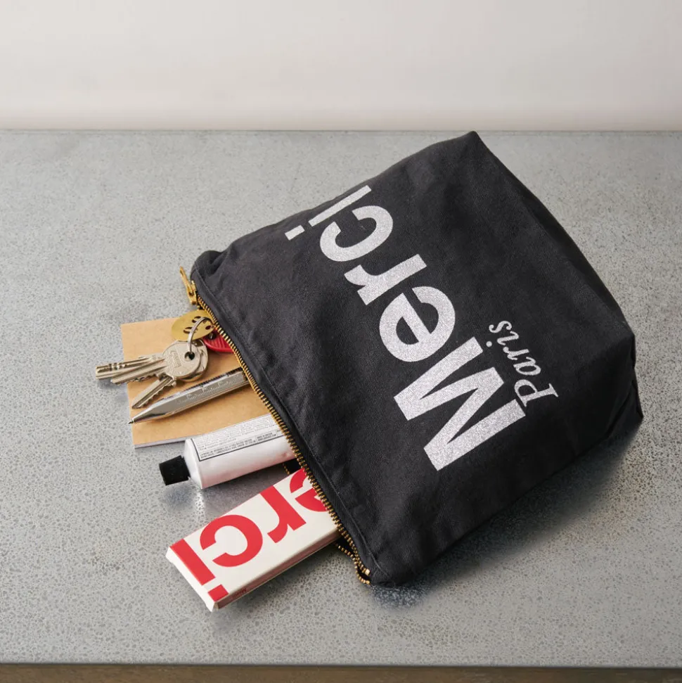 Merci adapte son iconique tote bag en format de pochette. Emportez un peu de Merci partout avec vous grâce à cette poc…