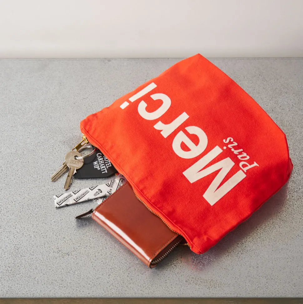 Merci adapte son iconique tote bag en format de pochette. Emportez un peu de Merci partout avec vous grâce à cette poc…