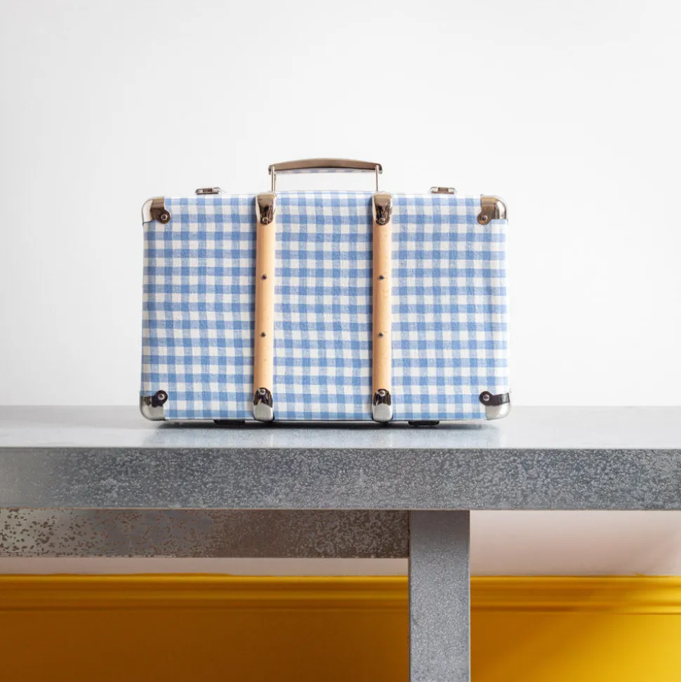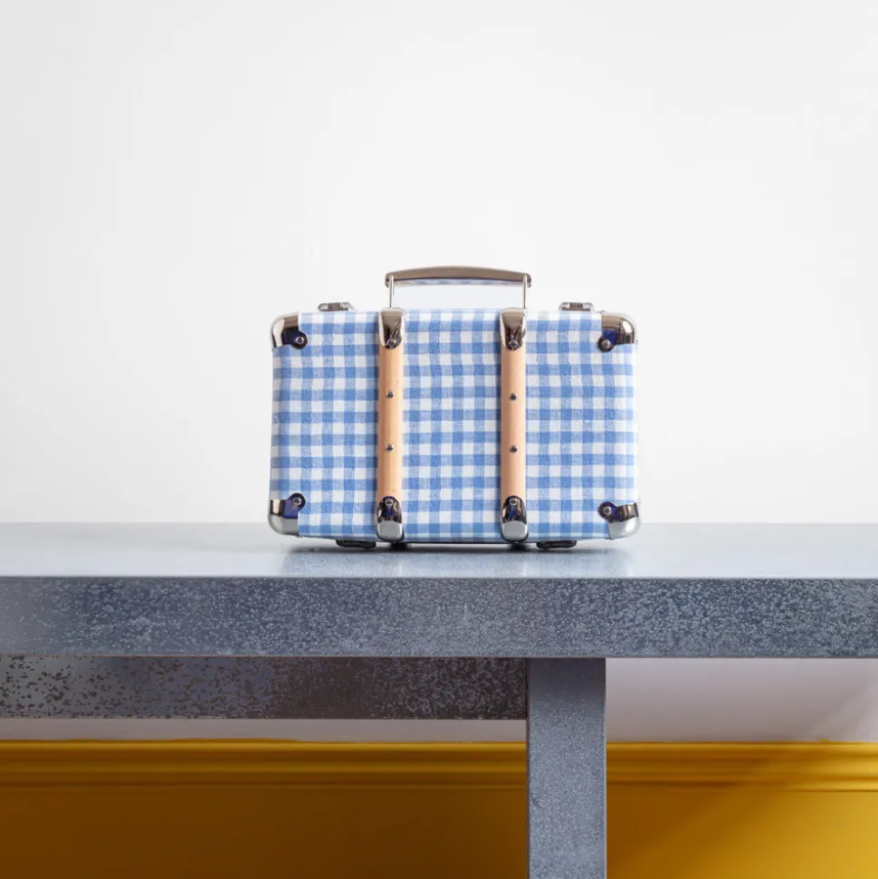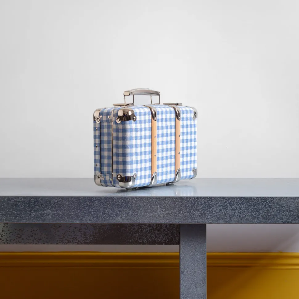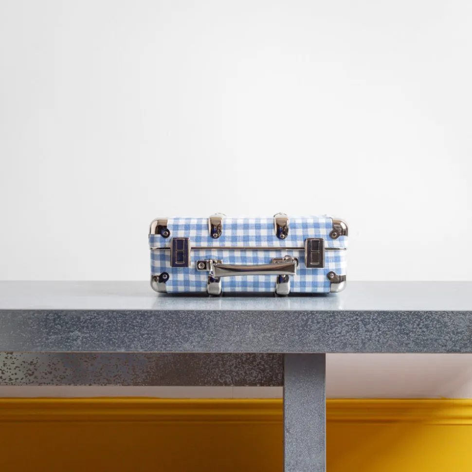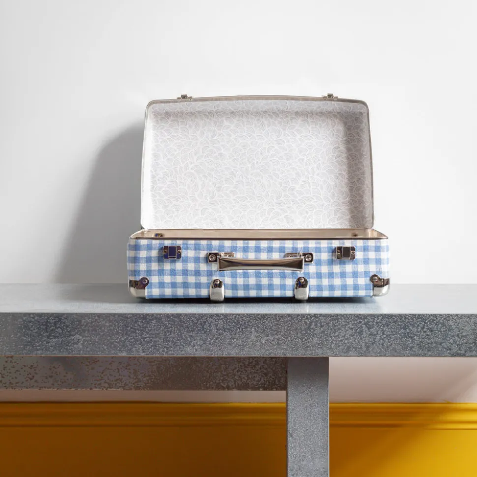 Valise rigide en carton bouilli kraft, renforcée par des éléments de fixation en acier et des clapets de fermeture qui semble sortir d’un décor new-yorkais