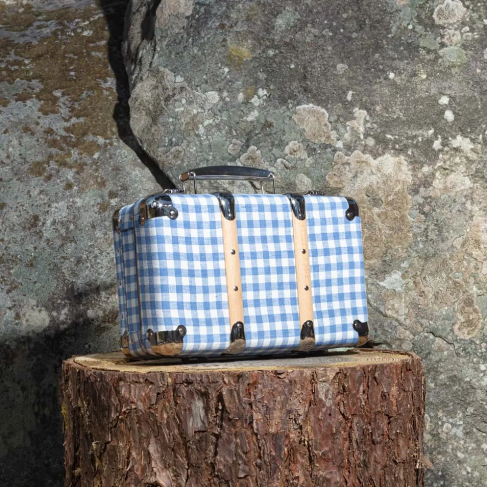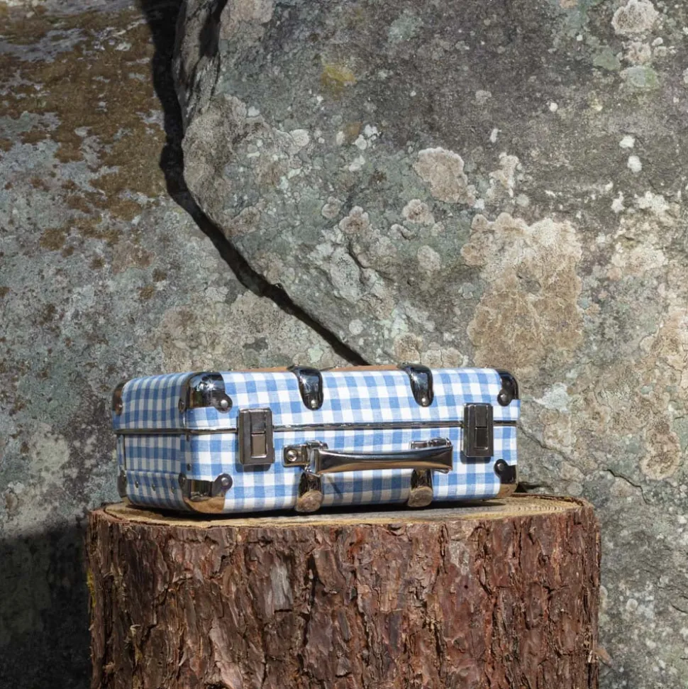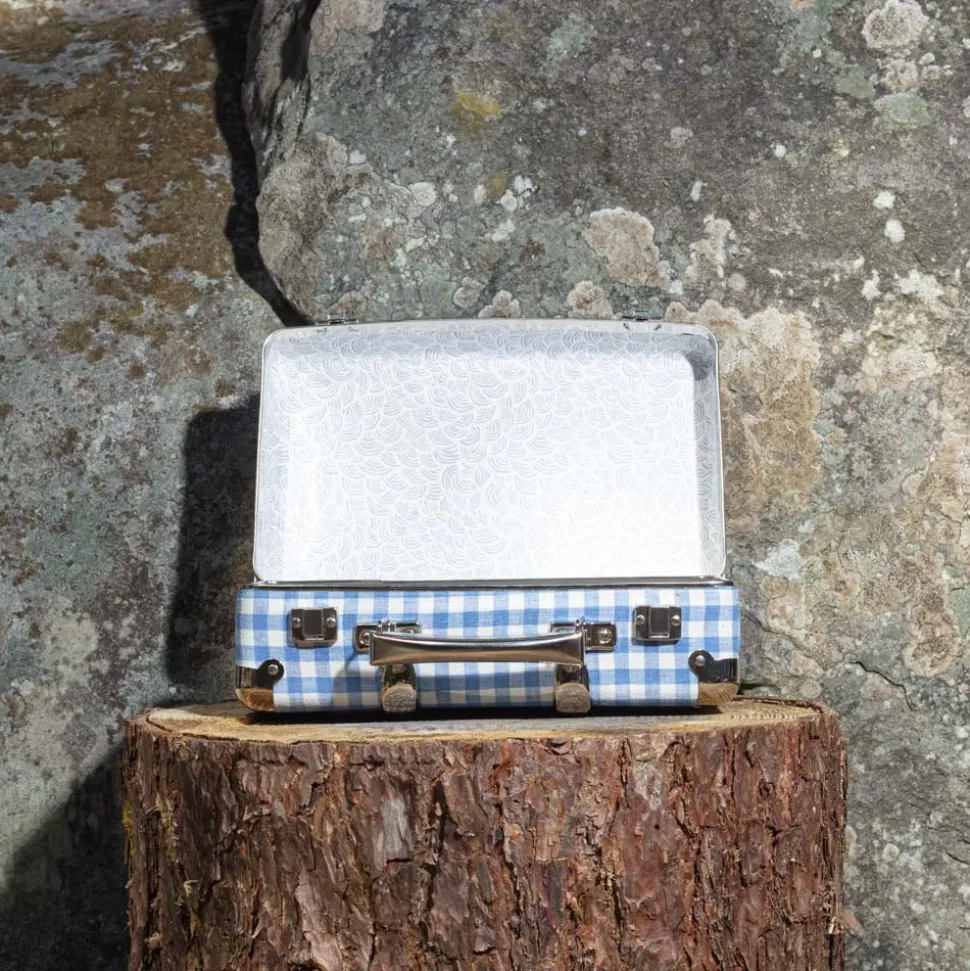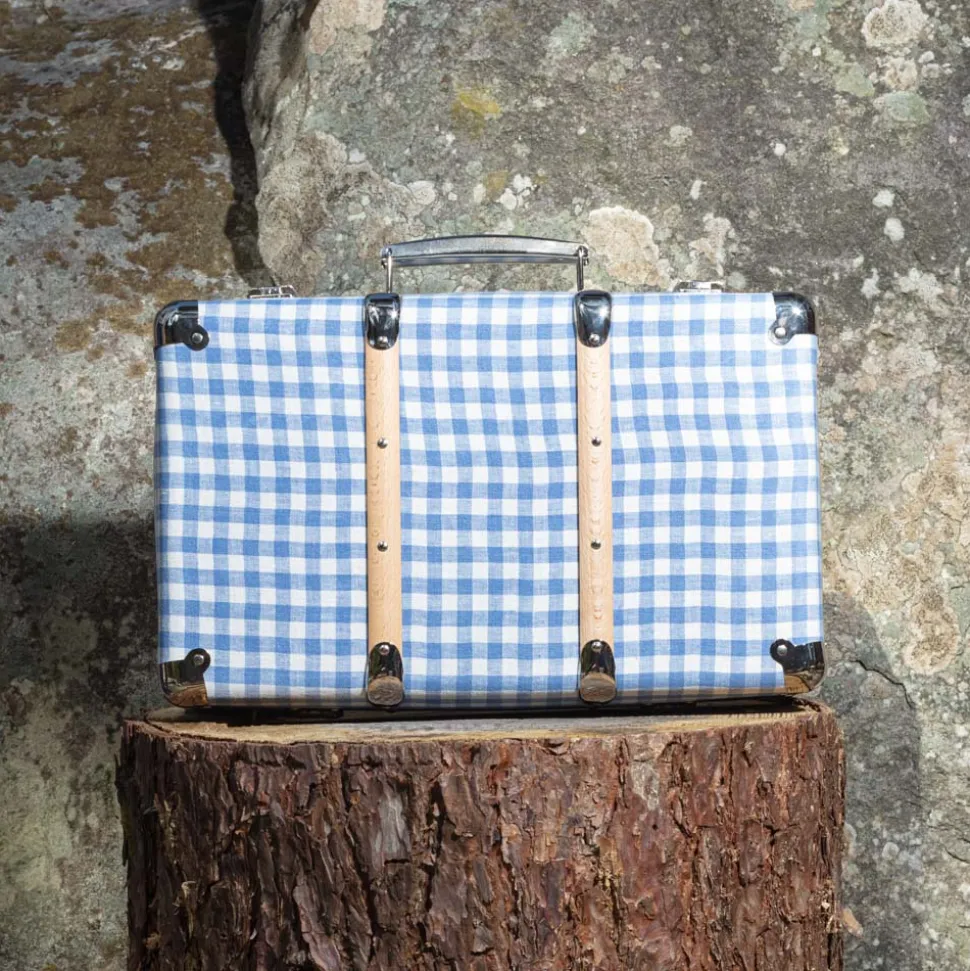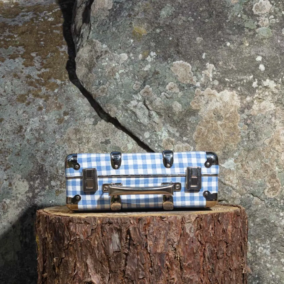 Valise rigide en carton bouilli kraft, renforcée par des éléments de fixation en acier et des clapets de fermeture qui semble sortir d’un décor new-yorkais