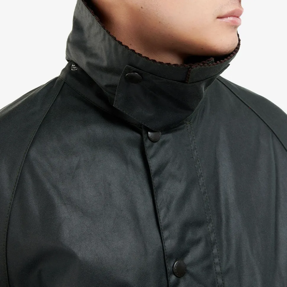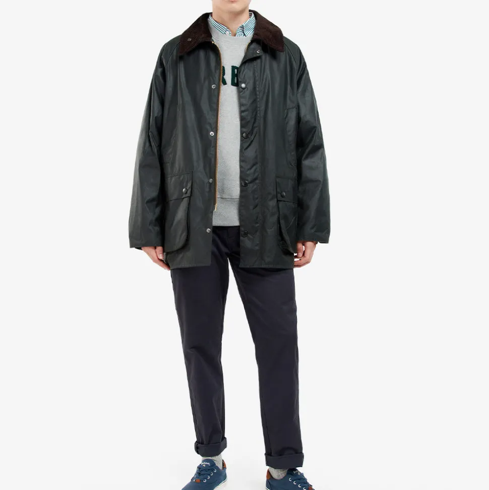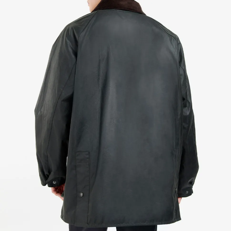 Longueur plus courte, une coupe décontractée, des aérations à l’arrière et l’indispensable « bande d’égouttage » intérieure en nylon qui empêche l’humidité des chevaux de s’infiltrer dans la veste. Les éléments classiques d’une veste Barbour sont tous inclus, avec une fermeture à glissière à double sens en laiton et un devant « Stormfly » clouté, deux grandes poches à soufflet et deux poches chauffe-mains doublées de moleskine, et le traditionnel col en velours côtelé avec des clous pour un rabat de gorge caché.