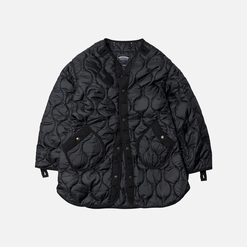 Veste extérieure sans col avec cordons de serrage et fermeture éclair YKK ; doublure matelassée avec bouton-pression