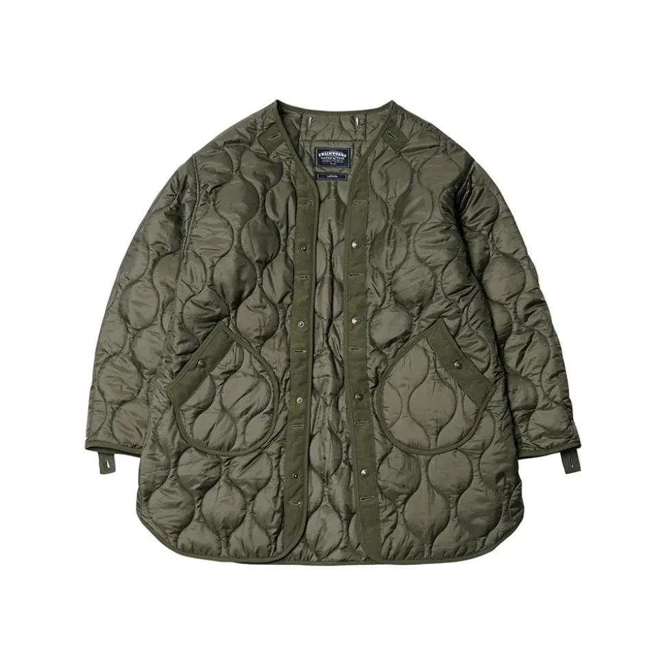 Veste extérieure sans col avec cordons de serrage et fermeture éclair YKK ; doublure matelassée avec bouton-pression