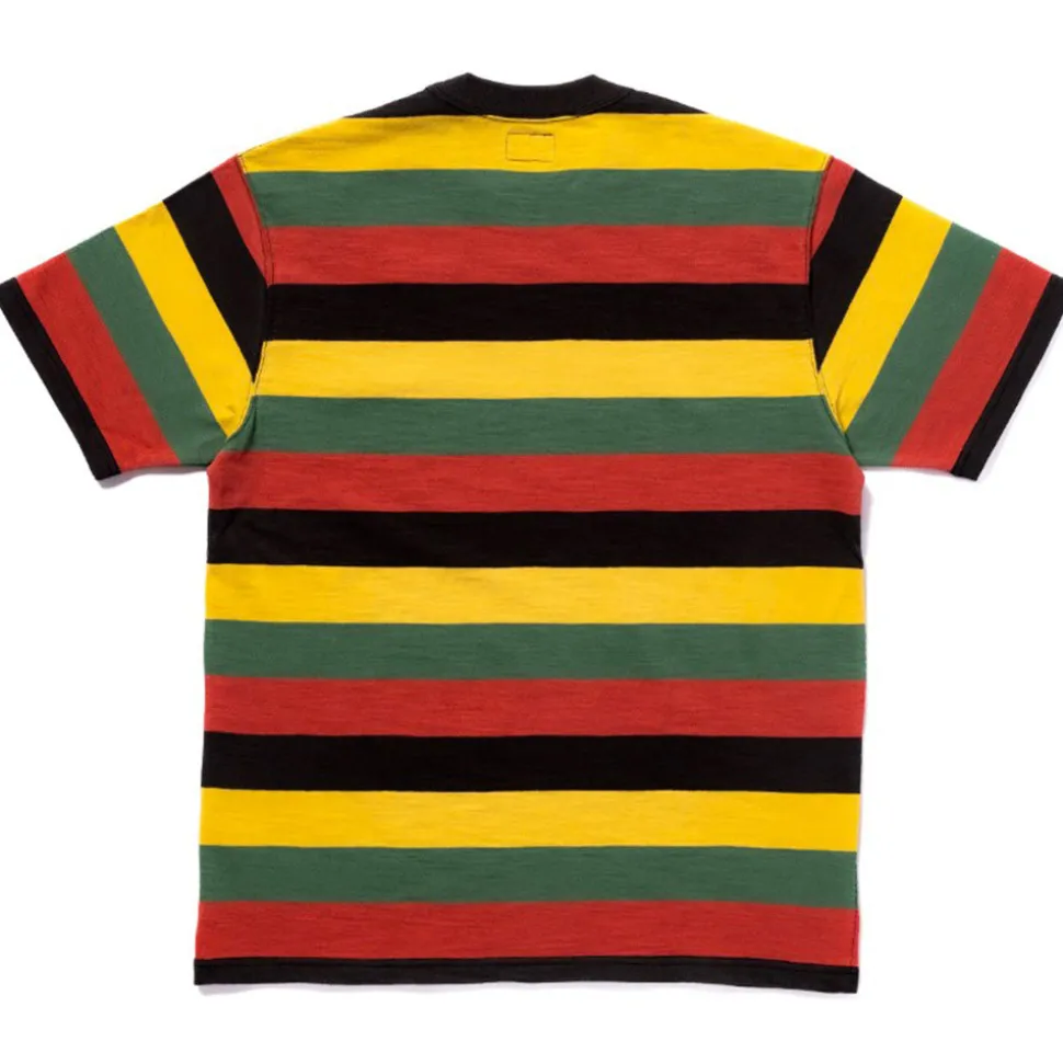 Reprend les couleurs universelles du Rastafari – rouge, or, noir et vert