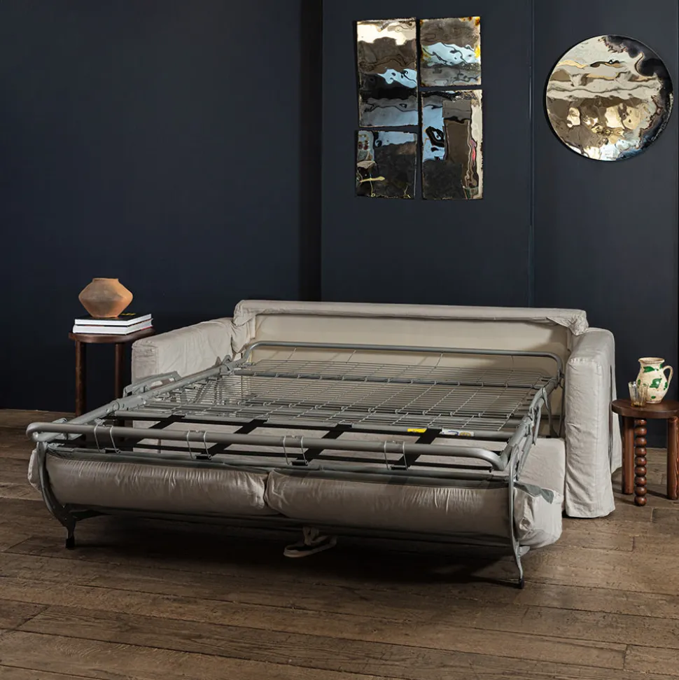 Merci décline son canapé iconique en canapé convertible double couchage (140×200 cm). Avec son design loose, il reste fidèle à l’image de la boutique et au canapé originel dessiné par Merci depuis 2009.