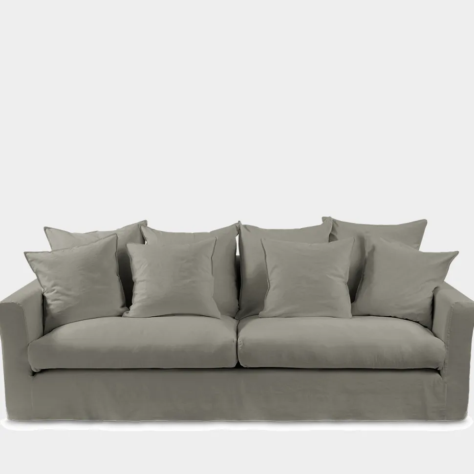 Le canapé Merci 4 places est vendu avec 4 coussins de 65×65 cm et 4 coussins de 55×55 cm. Dimensions: L 243 cm; P 110 cm; H 77 cm
