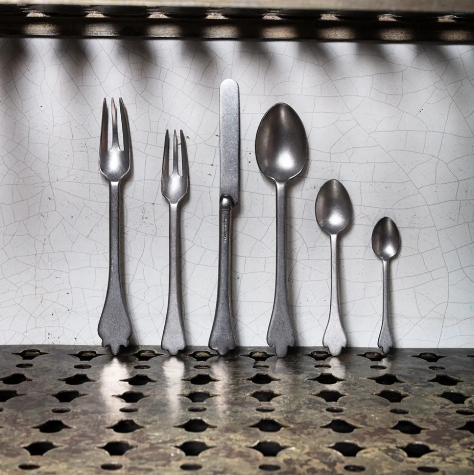 La collection Merci Mix est un appel à l’individualité et la différentiation, livrant bataille contre l’uniformité et la monotonie. Les six extrémités de manche différentes des cuillères, fourchettes et couteaux suivent l’évolution des couverts décoratifs depuis leur création. La finition irrégulière donne aux couverts un aspect usé, comme tout droit sortis d’un vide-grenier.